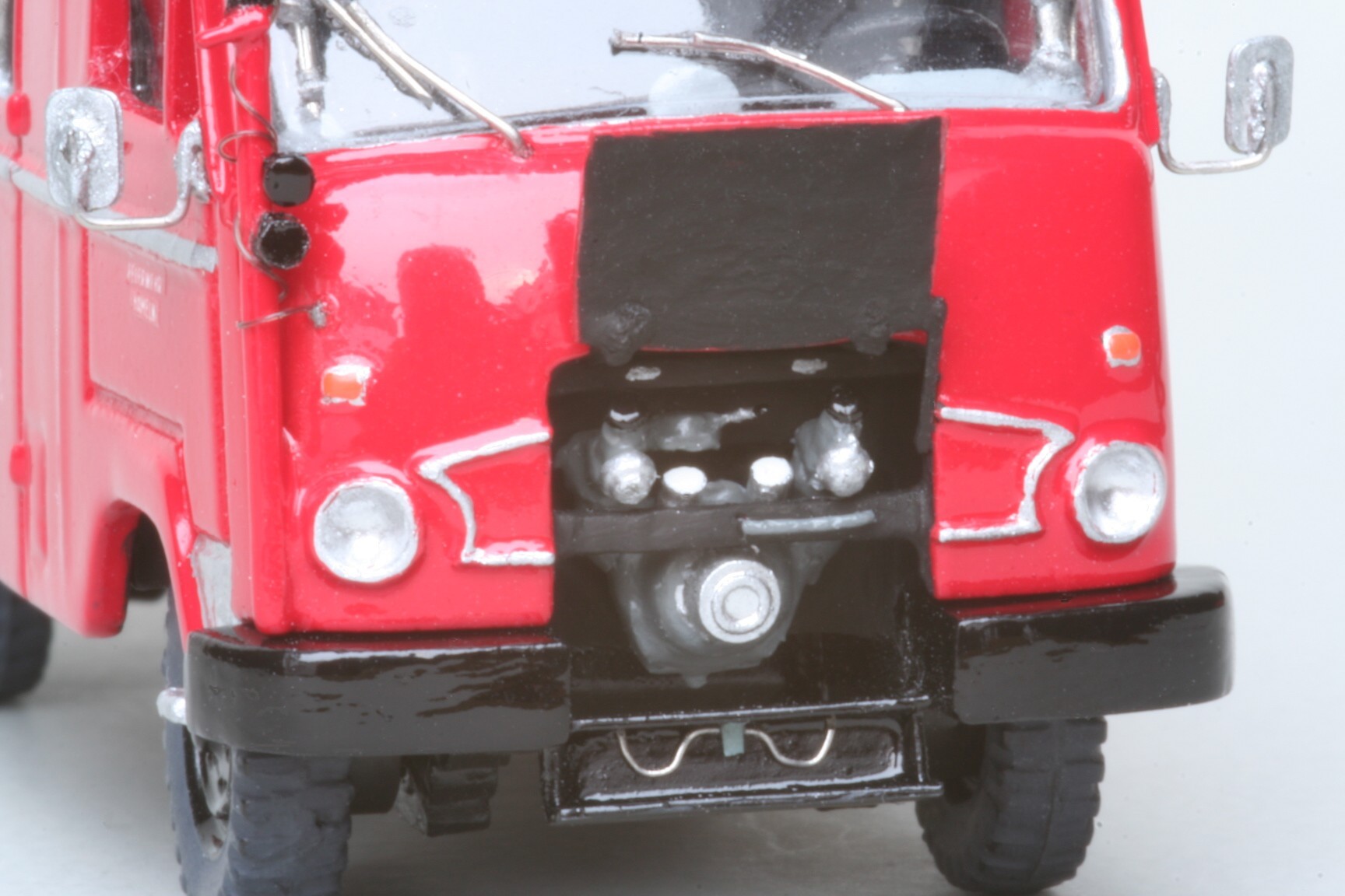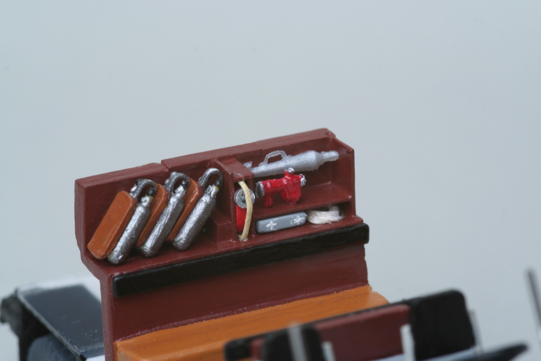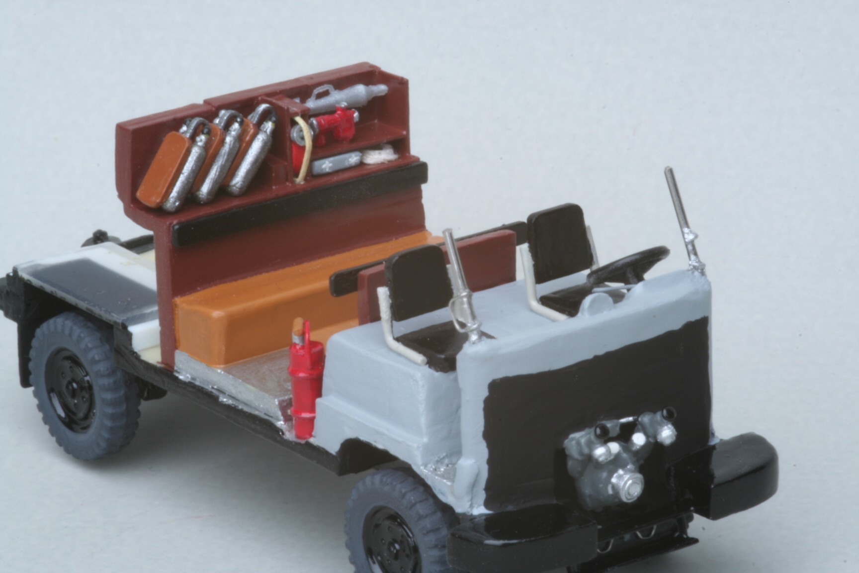 Die Sitze von Fahrer und Beifahrer wurden abgesägt und aus Draht eine Rohrstützkonstruktion für zweiteilige Sitze erstellt. Ähnlich wurde auch bei den Sitzbänken im Mannschaftsraum verfahren, damit hier die Rückenlehnen einzeln dargestellt werden konnten. Auf das Armaturenbrett habe ich noch die für Magirus typische halbrunde Scheibenlüftung gesetzt. Auch ein frei stehendes Lenkrad erhielt das Modell mitsamt einer filigranen Lenkradschaltung(mit der ich als junger Feuerwehrmann und FS-Klasse 3 Neuling im Original so meine Schwierigkeiten hatte