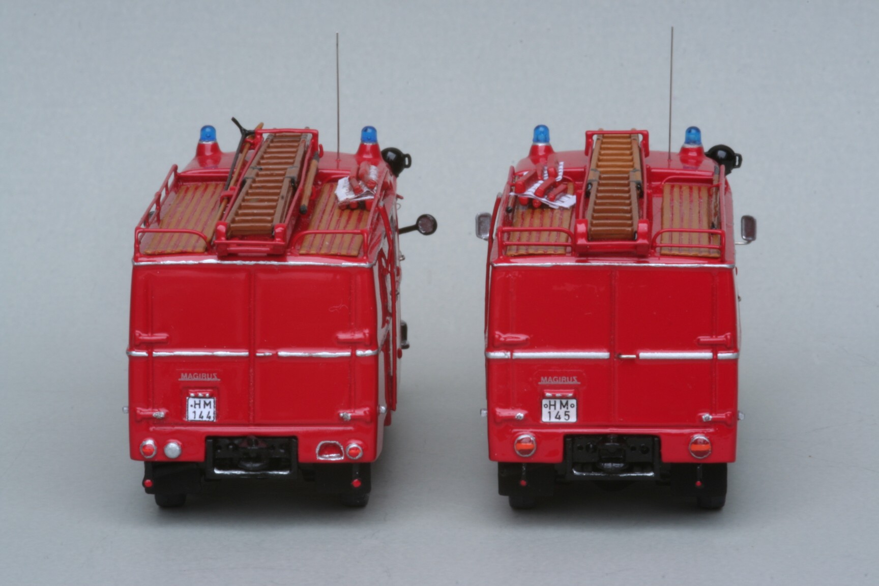 Das erste Bild zeigt den Längenunterschied. Das vordere Fahrzeug ist das ältere mit dem um 100mm kürzeren Radstand. Im zweiten Bild sieht man die Unterschiede am Heck: Links das ältere Fahrzeug mit der großen Trittmulde, den kleineren Leuchten und separatem Rückfahrscheinwerfer. Das dritte Bild zeigt die vorderen Türen im Vergleich: Bei dem älteren Fahrzeug im Vordergrund sind die Türen unten deutlich schmaler gehalten, um Platz für eine Trittmulde daneben zu erhalten. Außerdem hatte dieses Fahrzeug aus dem Jahre 1962 noch Winker statt Blinker. Die Blinker sind später nachgerüstet worden, während sie bei dem Fahrzeug aus dem Jahr 1964 bereits Standard und die Winker gar nicht erst vorhanden waren. Das vierte Bild zeigt, dass die Dachaufstiegsleiter bei dem älteren Fahrzeug(links) noch auf der Beifahrerseite war, während sie bei dem zweiten Fahrzeug auf die andere Seite wechselte. Außerdem ist die Klappe über dem Tankstutzen von der Position hinter der Mannschaftstür in eine Lage vor der Tür gewechselt und darüberhinaus auch größer geworden. Das letzt Bild habe ich aus dem Archiv herausgekramt