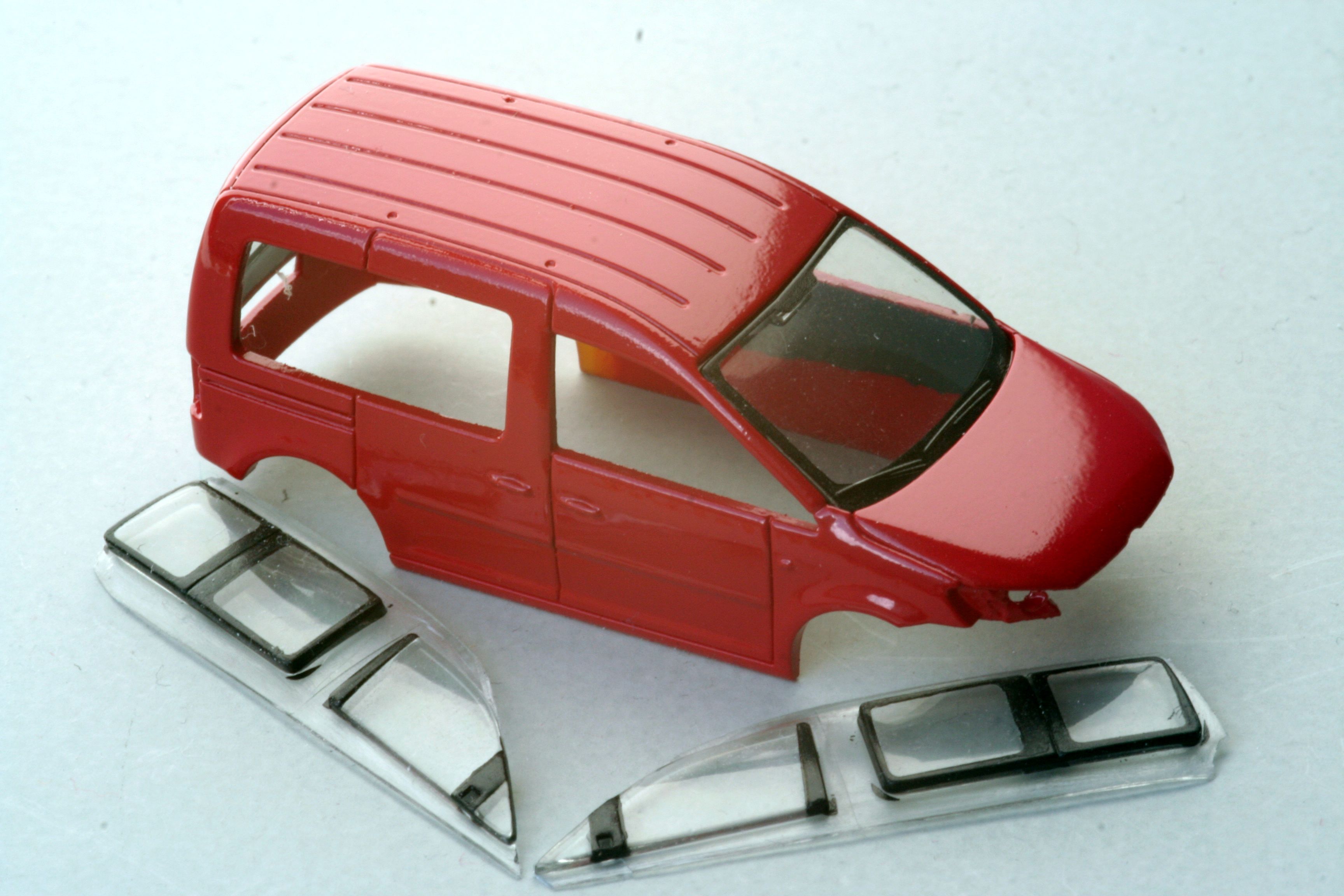 Für das Modell habe ich einen VW Caddy von Rietze in Postausführung genommen, denn nur die Maxiversion des Caddy gab es von Rietze in dem originalen VW-Rotton zu kaufen. Als Farbe habe ich RAL 3003 verwendet, denn dieser Ton kommt der VW-Farbe sehr nahe. Da ich zum Lackieren den Fenstereinsatz, der sehr stramm sitzt, ausbauen musste, brach mir eine der A-Säulen. Nach Kleben, Verschleifen und Lackieren sollte sie beim Wiedereinbau der Fenster nicht wieder kaputt gehen. Deshalb habe ich den Fenstereinsatz in vier Teile zersägt, die sich leicht einbauen lassen.