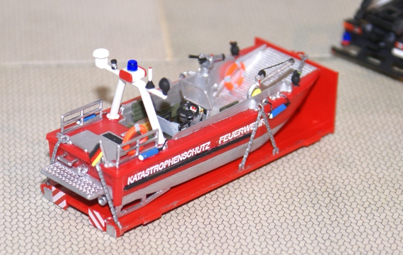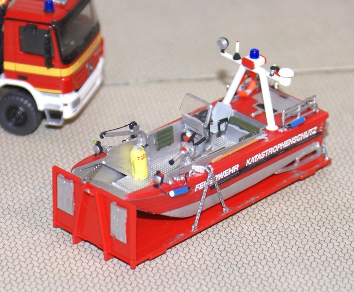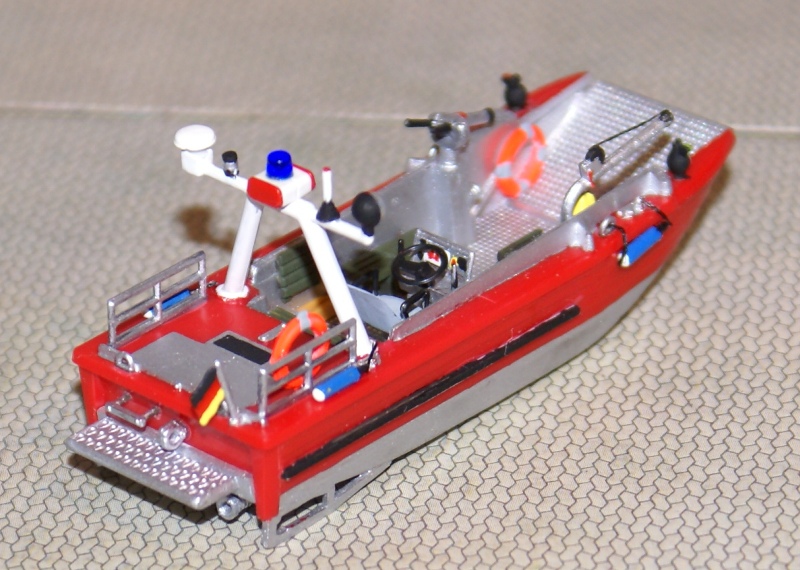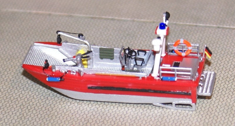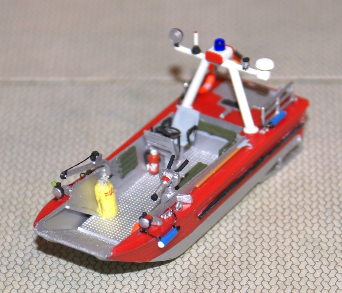 Details ergänzt: Scheinwerfer, Kranösen, Bootshaken, Wasserwerfer, kleiner Galgen für eine Hebewinde, wasserdichter Sack für Material, Sitzbänke, Feuerlöscher, Rettungsringe, Fender, Plattform für Taucher am Heck und schließlich ein bisschen Farbe an einigen Stellen.