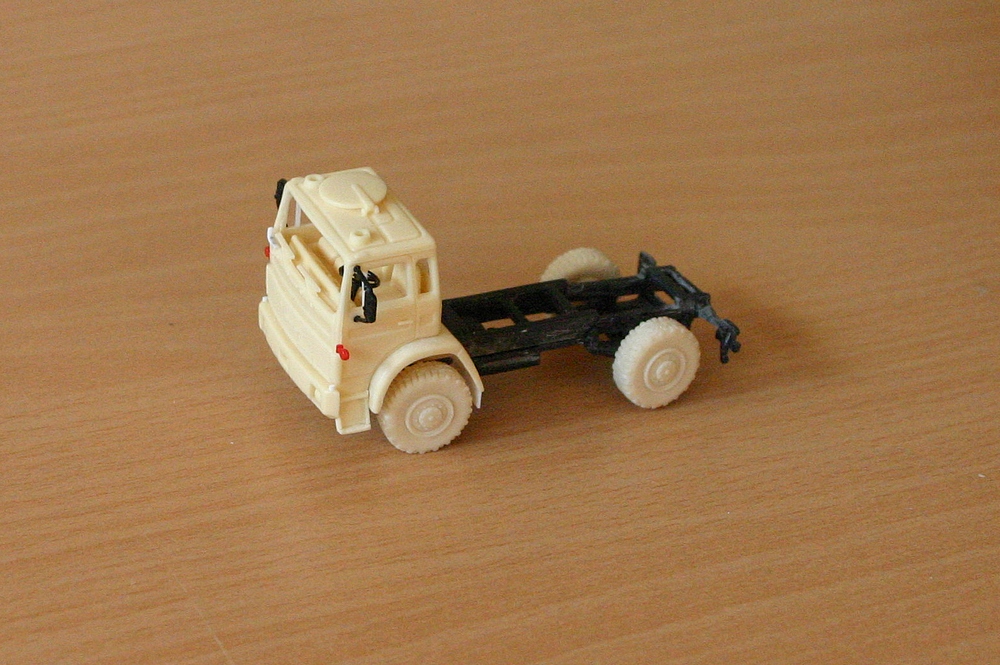 Im Bereich des Fahrgestells entsprachen Batteriekasten u.ä. nicht dem Vorbild. Deshalb habe ich alle diese Teile entfernt. Alle Anbauteile werden entsprechend dem Vorbild neu angebracht. Nach geringen Säuberungsarbeiten und bevor das Fahrerhaus in die Lackiererei wandert, habe ich zunächst am Fahrerhaus folgende Teile ergänzt: