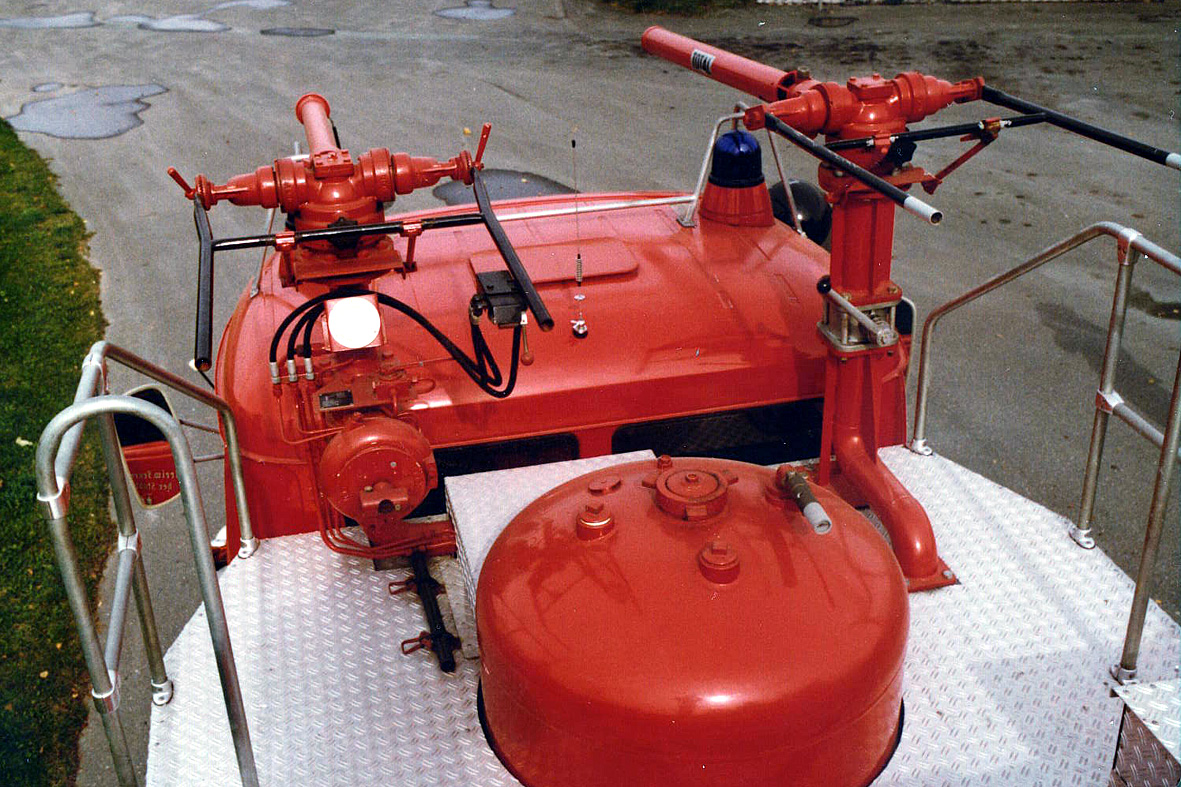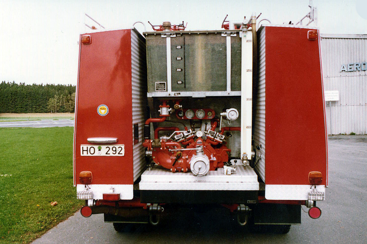 Gruß, JürgenDas einzige zu dieser Zeit von Bachert für einen deutschen Flughafen gebaute Löschfahrzeug wurde im Jahr 1974 an den Flughafen Hof-Pirk geliefert. Als Basis für dieses als S-TLF 16 bezeichnete Fahrzeug diente wiederum ein mit einem serienmäßigen Lkw-Fahrerhaus versehener Mercedes-Benz LAF 1113 B. Das Fahrzeug war außer mit einer 1000-Kilogramm-Pulverlöschanlage des Fabrikats Total noch mit einem 2000-Liter-Wassertank und einem 500-Liter-Schaummittelbehälter ausgestattet. Die Feuerlöschkreiselpumpe war als FP 16/8 ausgeführt. Als Besonderheit verfügte das Fahrzeug über jeweils einen Schaum-/Wasserwerfer und einen Pulverwerfer, die auf einer Plattform hinter der Fahrerkabine angeordnet waren. Auf dem Flughafen Hof wurde das Fahrzeug bis zur Aussonderung im Jahr 2002 genutzt.