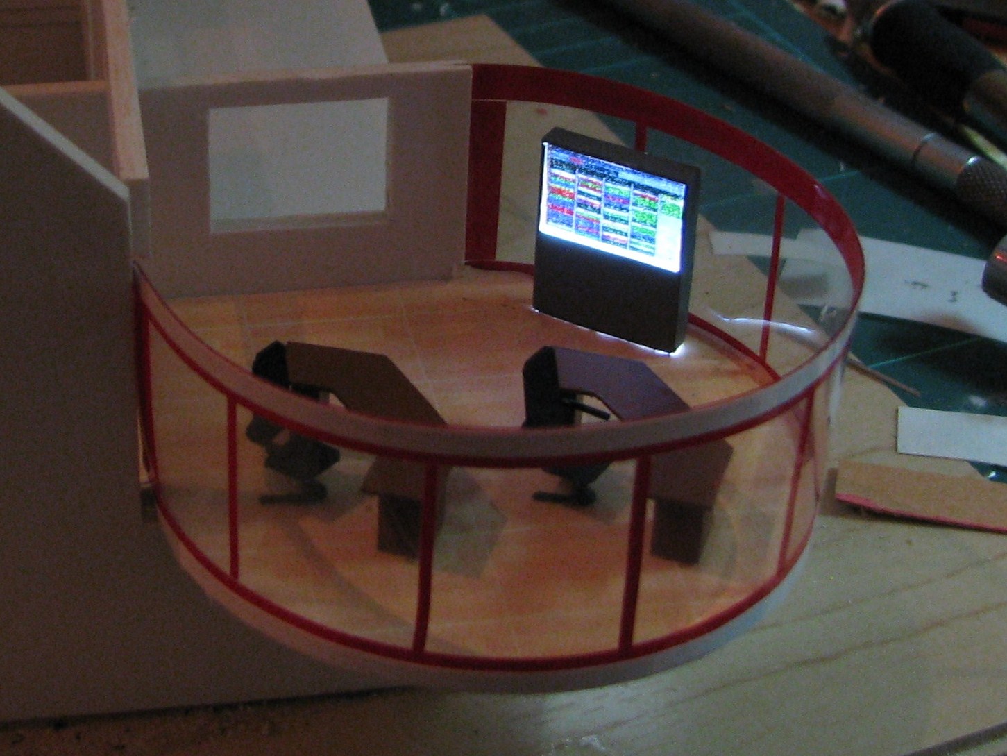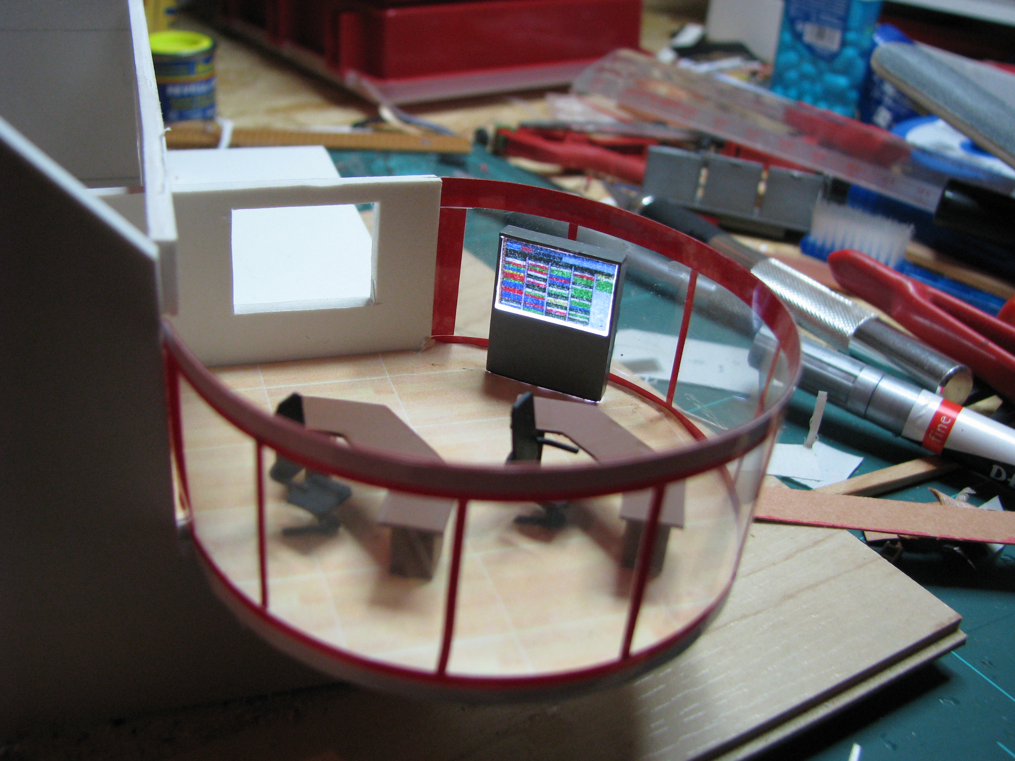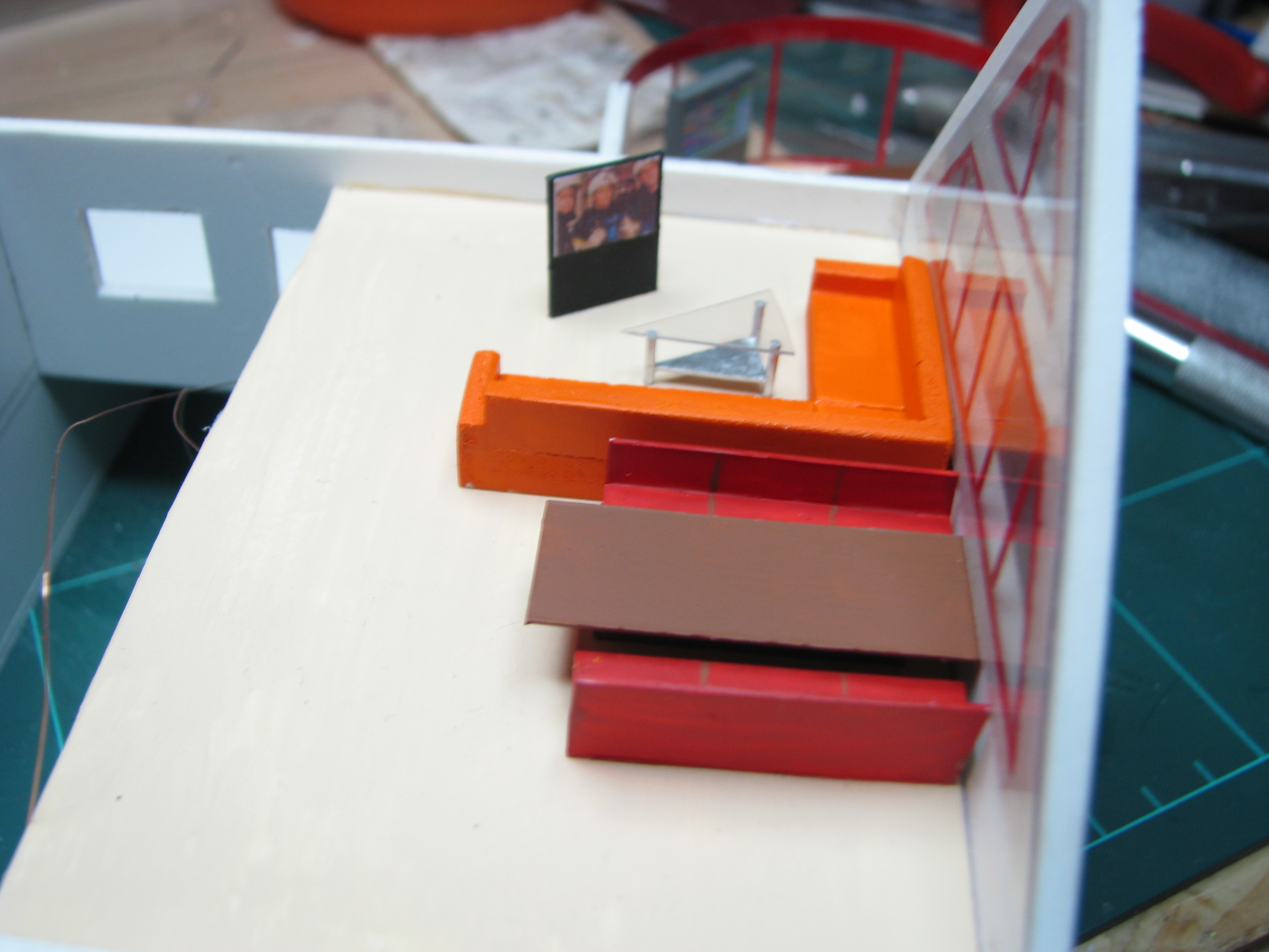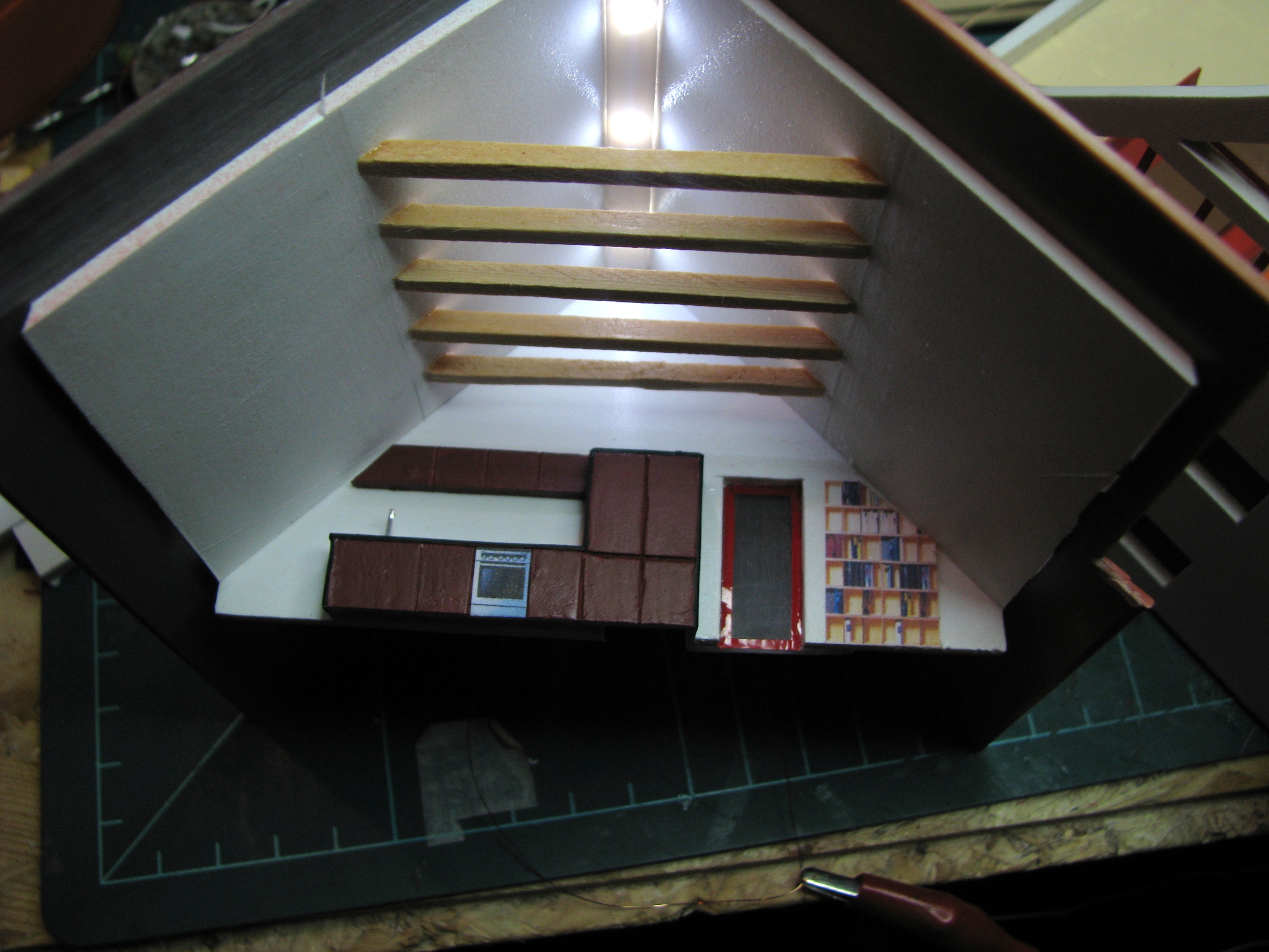Und wieder bin ich ein kleines Stück weiter auf dem langen Weg. Heute ist war der Aufenthaltsraum an der Reihe und hat Möbel und Farbe bekommen.So entstand aus Forex, Farbe und diversem Bastelkramm die Inneneinrichtung und die Berleuchtung (3x SMD-LED 0805).