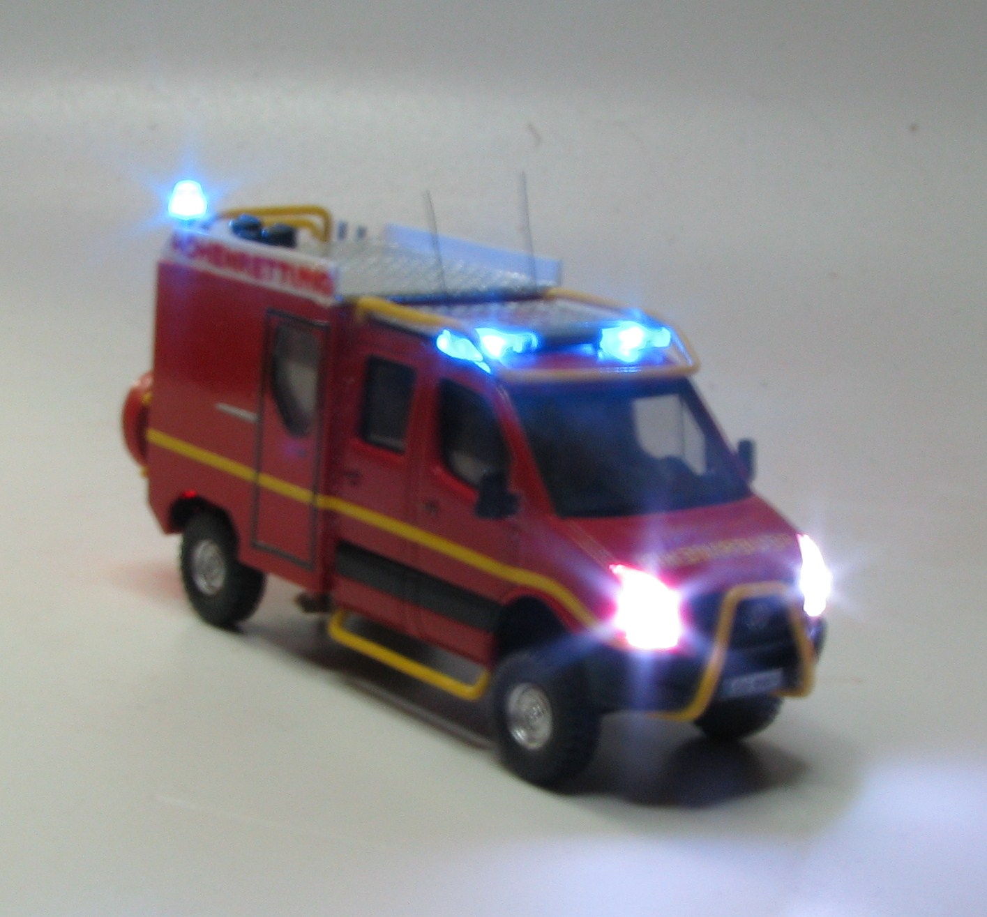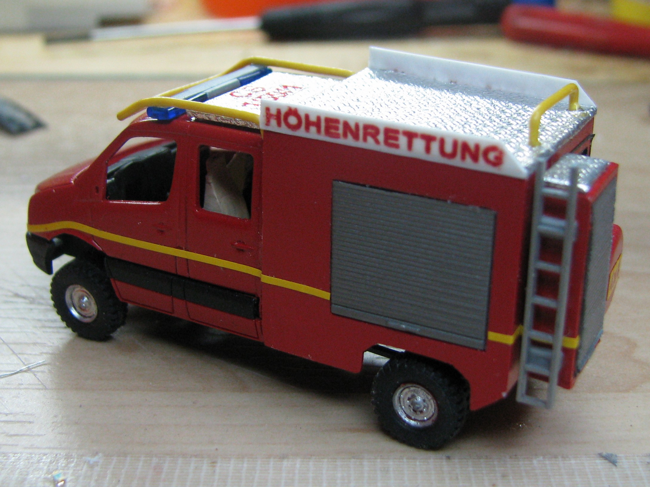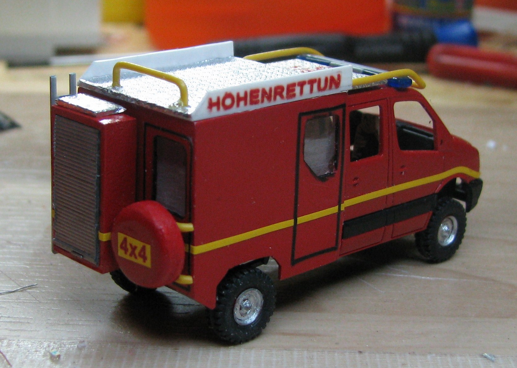 Zum Modell: Übernommen wurde Herpa VW Crafter die komplette Fahrerkabine und das Fahrgestell, welches allerdings auf Allrad umgebaut wurde. Der Aufbau mit dem Durchschub für die Trage entstand komplett im Eigenbau, wozu auch ein Durchbruch und eine neue Anordnung der hinteren Sitze gehört. Die Radsätze stammen von einem Roco Hummer.