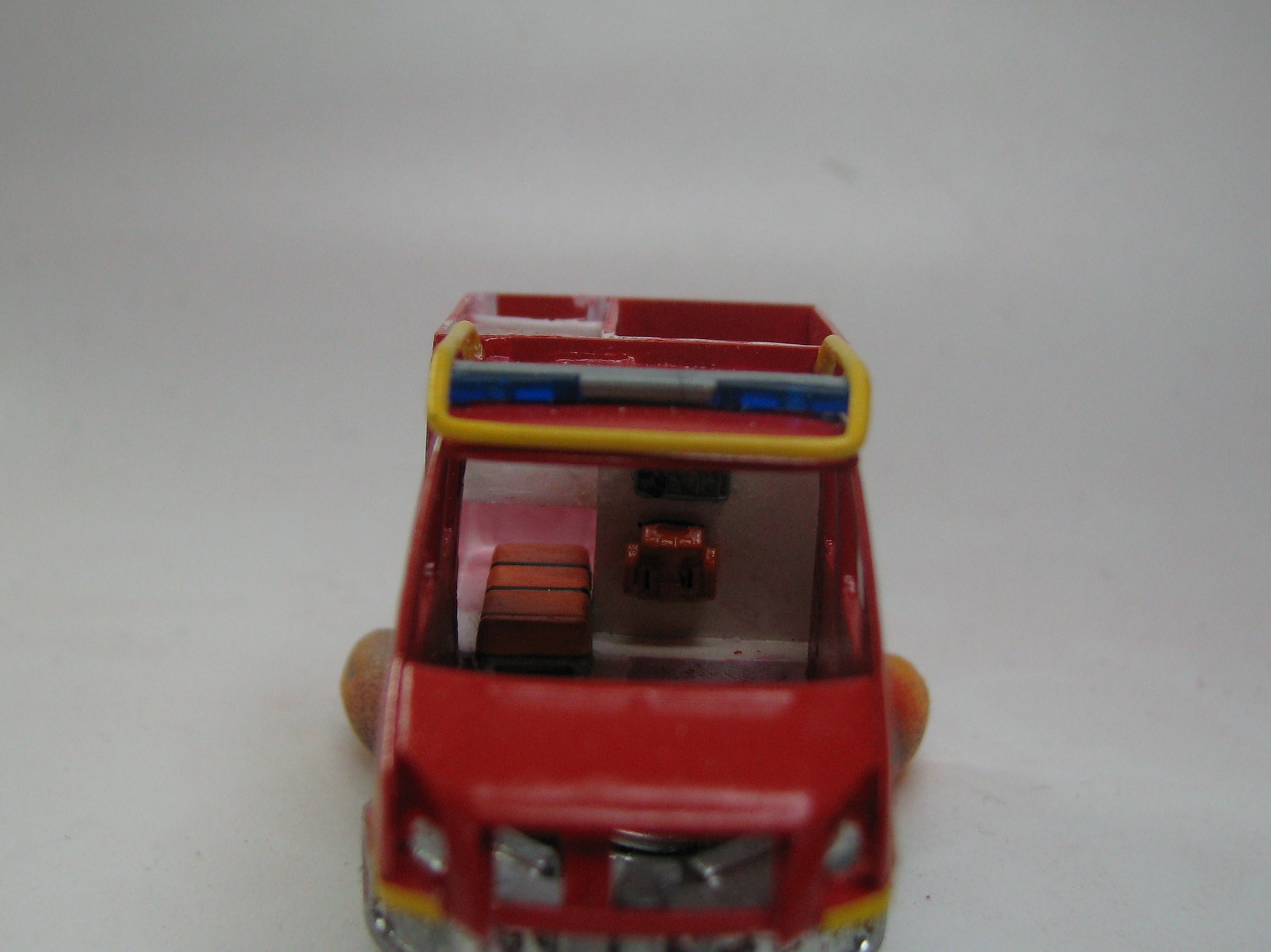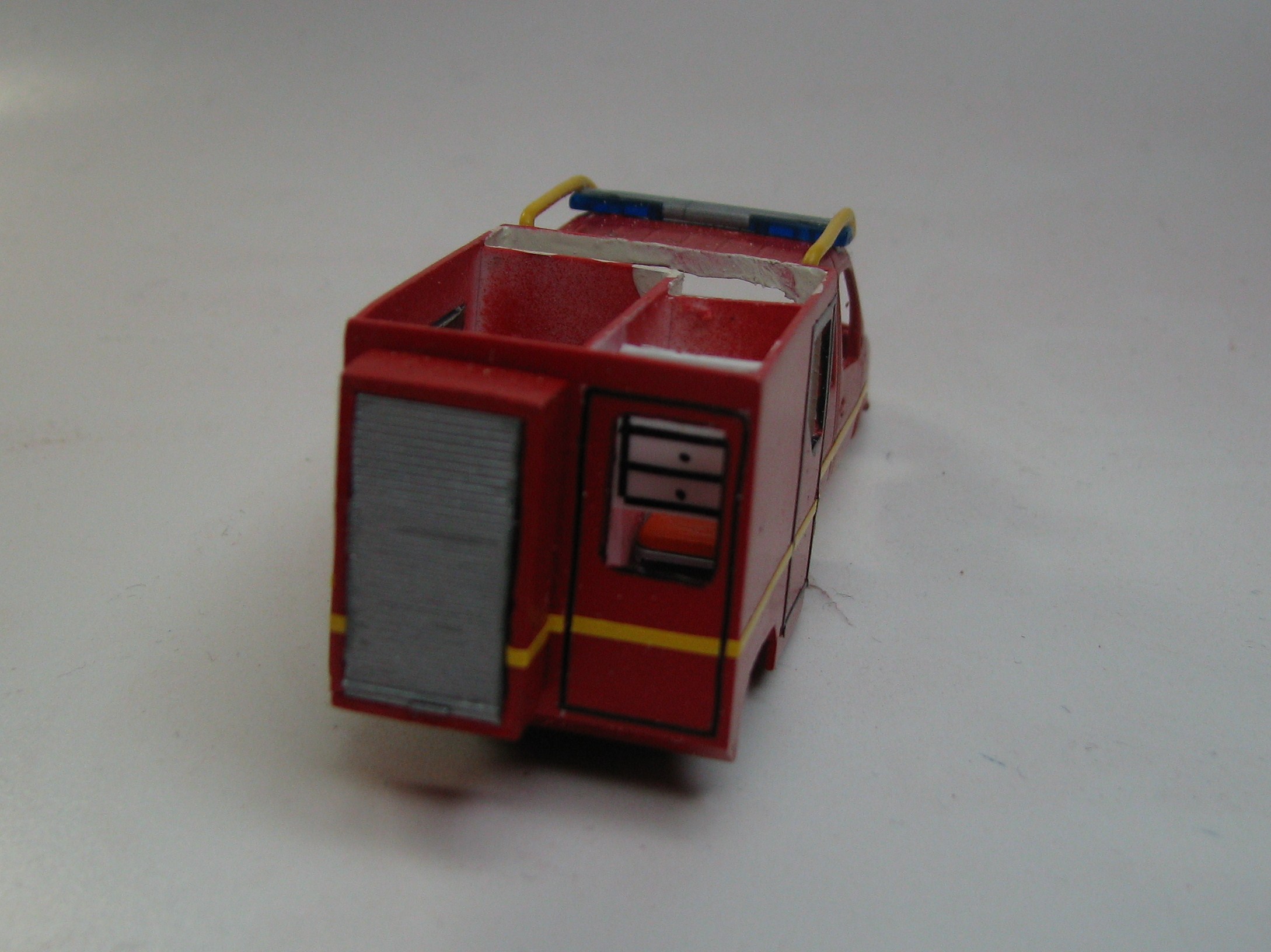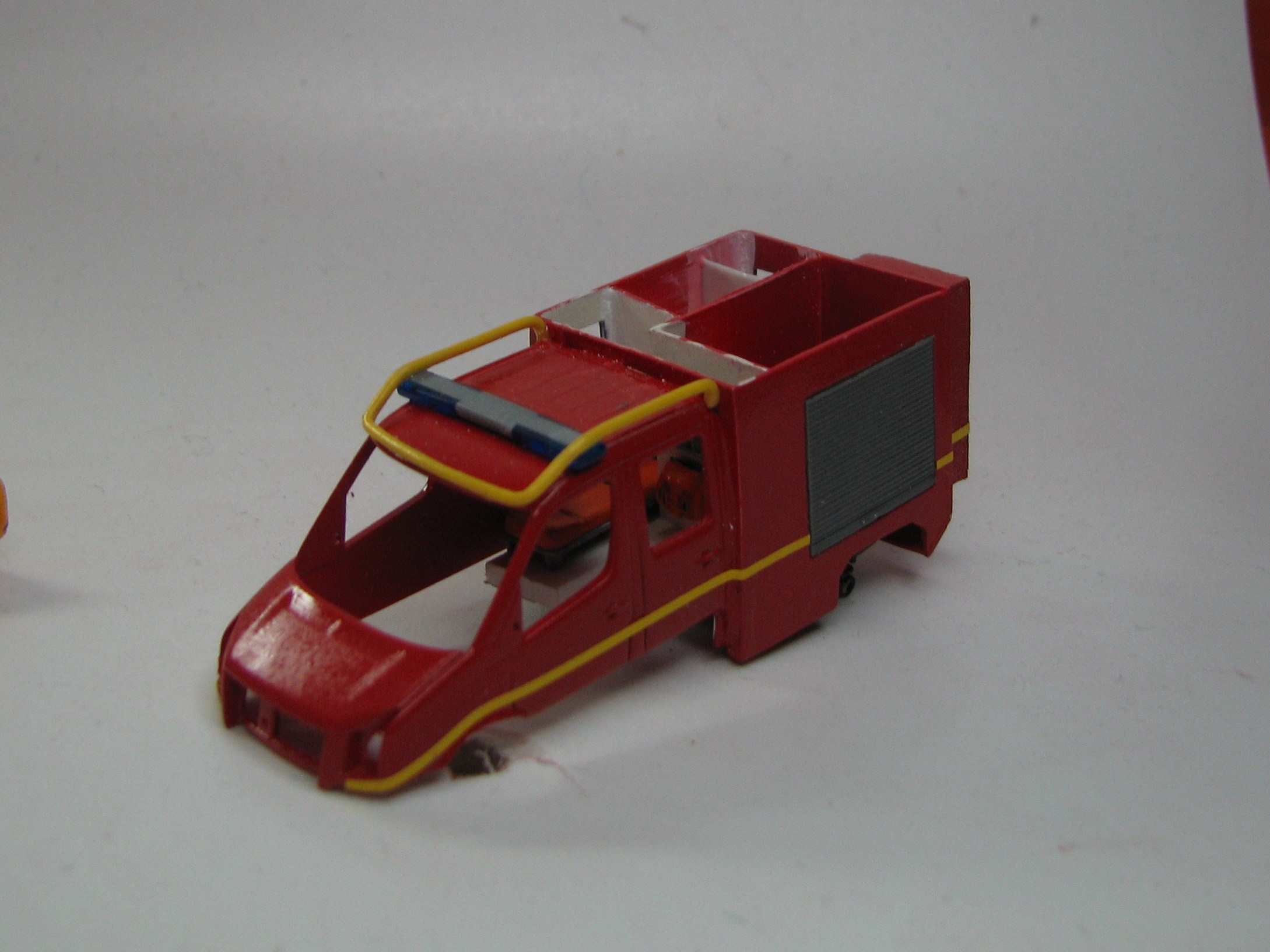 Zum Modell: Übernommen wurde Herpa VW Crafter die komplette Fahrerkabine und das Fahrgestell, welches allerdings auf Allrad umgebaut wurde. Der Aufbau mit dem Durchschub für die Trage entstand komplett im Eigenbau, wozu auch ein Durchbruch und eine neue Anordnung der hinteren Sitze gehört. Die Radsätze stammen von einem Roco Hummer.