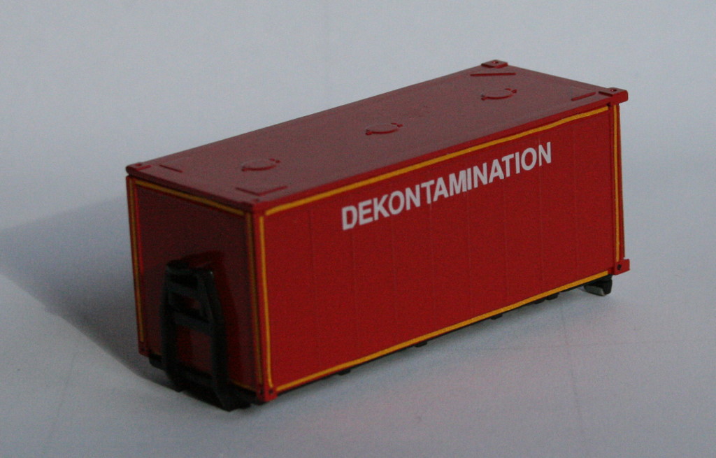 Der AB-Pulver wurde auf einem langen Rahmen von Merlau aufgebaut. Die Pulverkessel sind Ladegut eines Eisenbahnwagens(gibt es im Viererpack bei Conrad).Dazu Eigenbauplattform mit Werfer und div. Kleinteile, der AB-Dekon ist ein 20ft. Container.