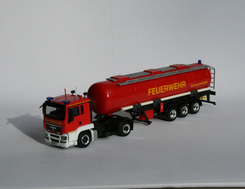 Nun noch die neue Zugmaschine mit überholtem Schaummitteltankauflieger.Zugmaschine aus Teilen Extra SHop, der Aufliger ist ein alter Herpa-Tankauflieger, der feuerwehrgerecht umgebaut und lackiert wurde.