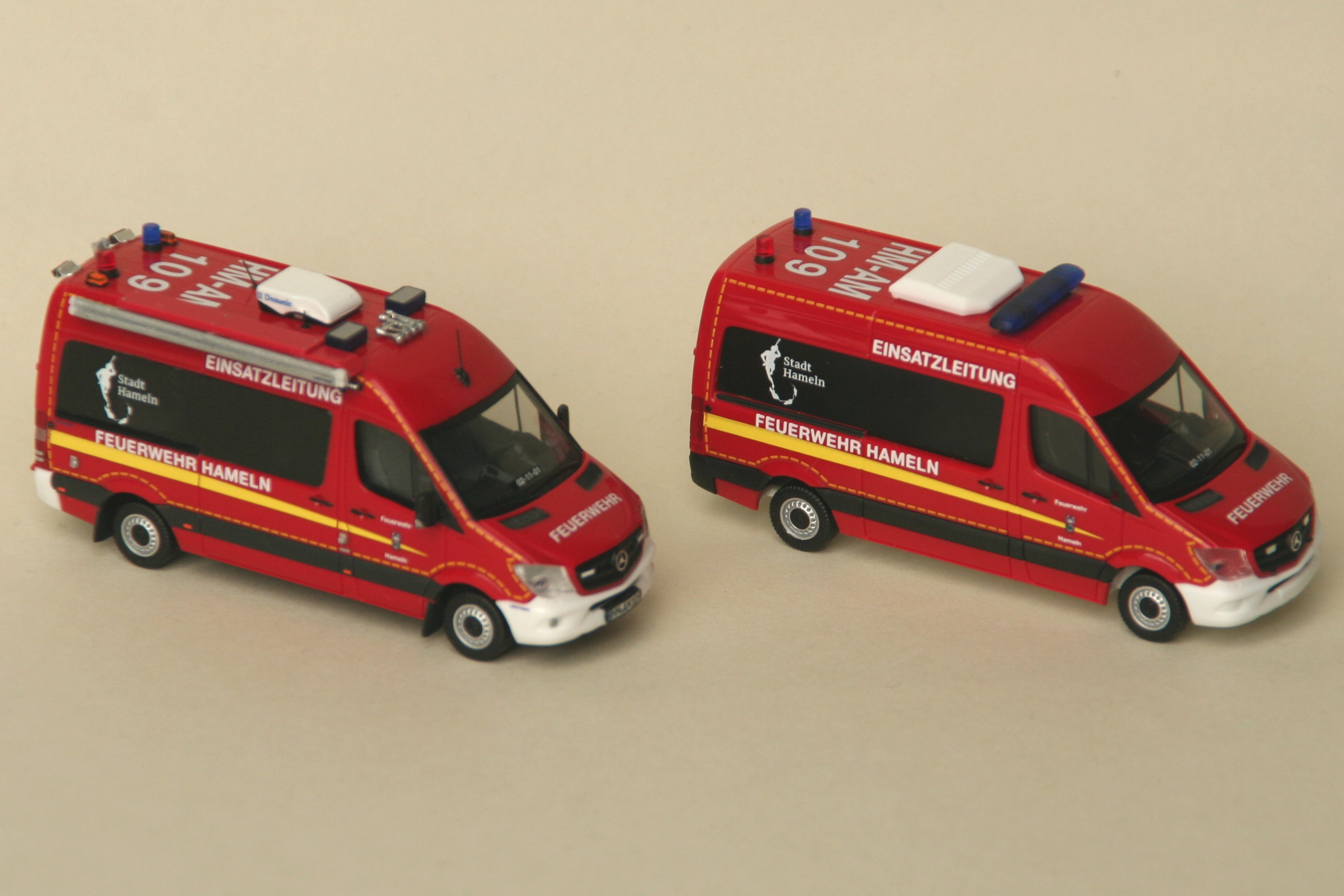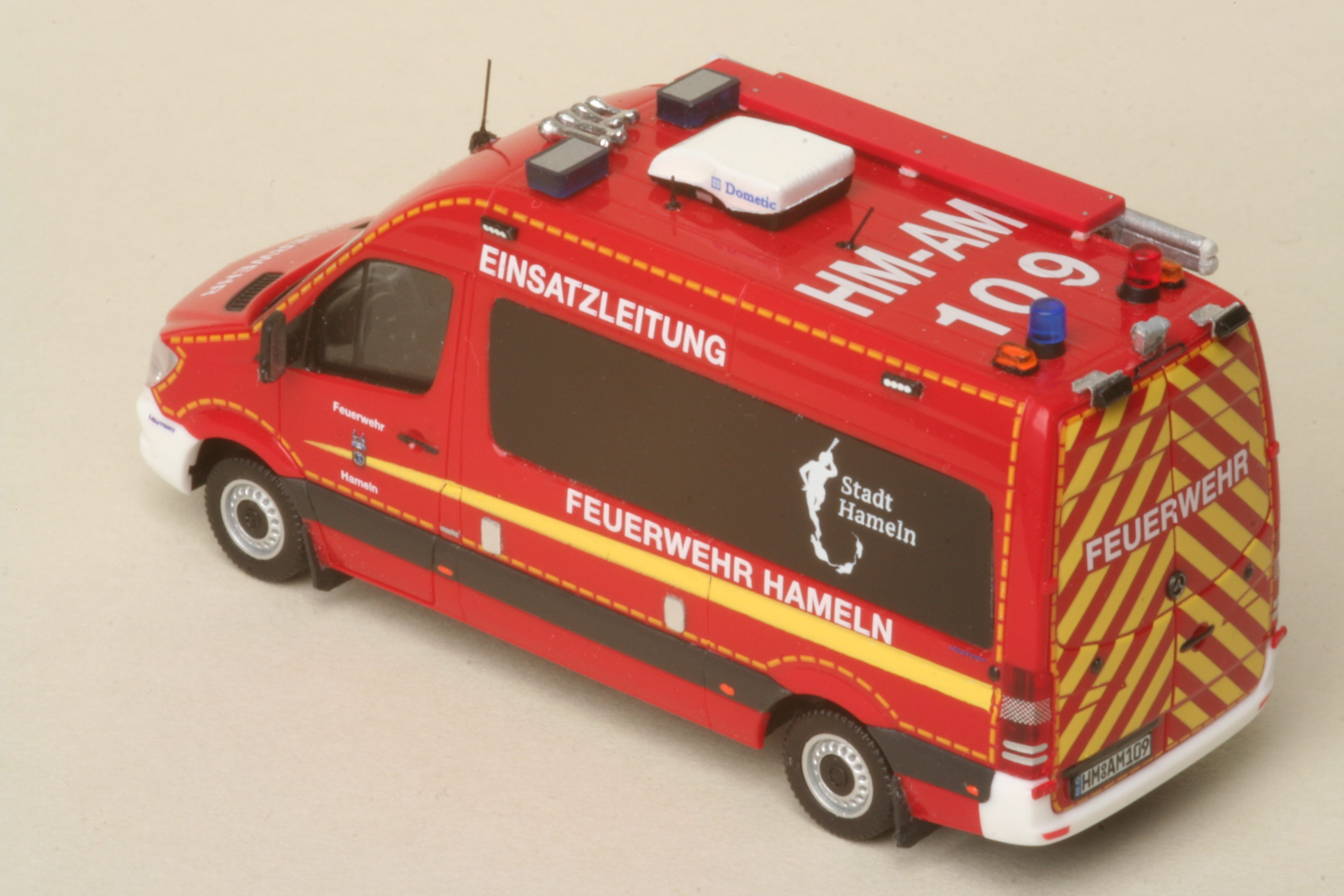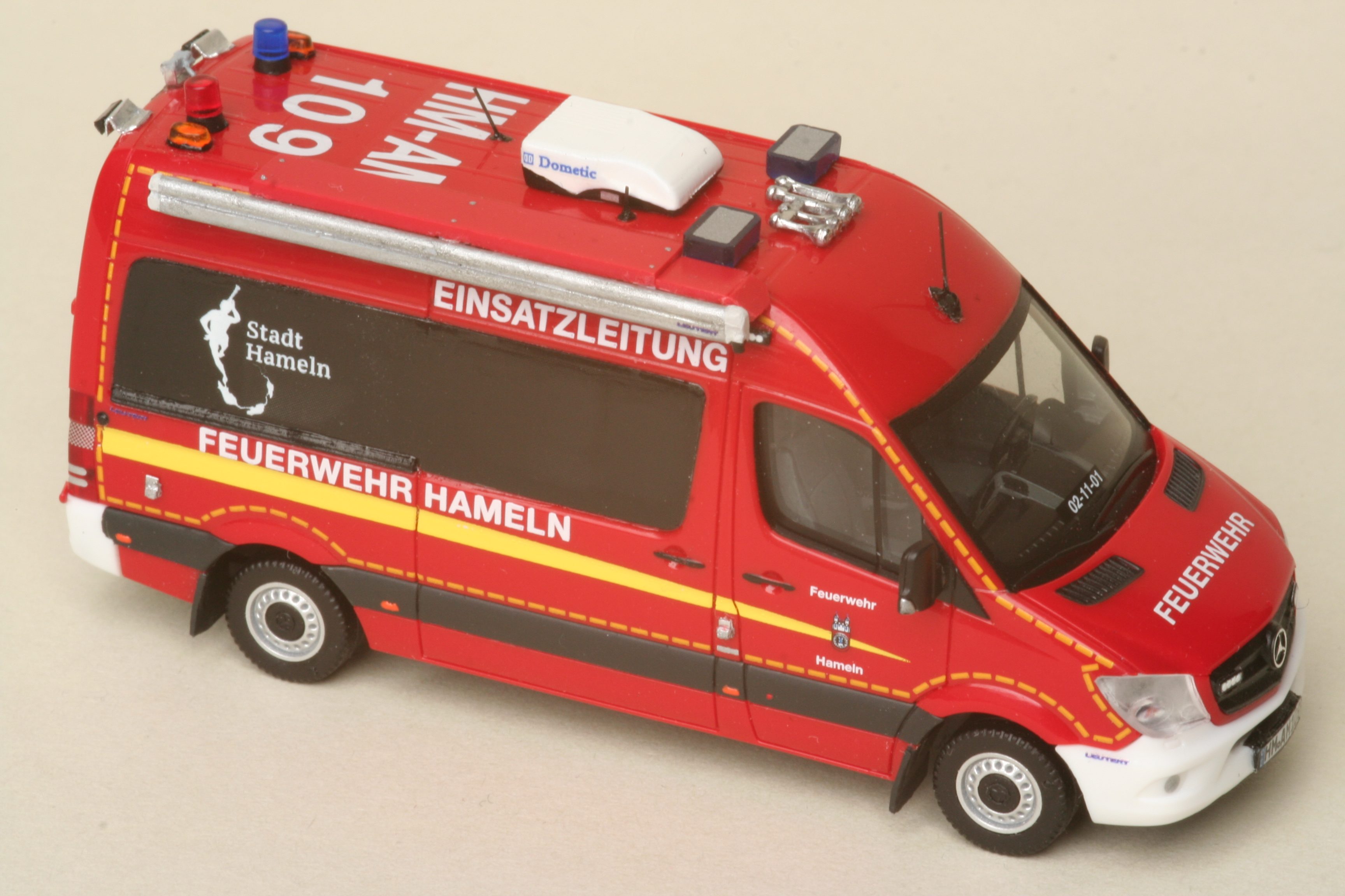 im November 2019 brachte Herpa als Sondermodell für den Handel in Norddeutschland ein Modell dieses ELW link der Feuerwehr Hameln heraus. Hier gab es modellbautechnisch einige Kompromisse zu machen. So gibt es im Formenfundus von Herpa keine passende Dometic Dachklimaanlage, keine einzelne Blaulichtecken und eine vorbildgerechte Markise samt Träger gibt es bei keinem Großserienhersteller. Die Bedruckung des Modells dagegen konnte vorbildgetreu auch mit dem Rattenfängerlogo der Stadt Hameln erstellt werden.