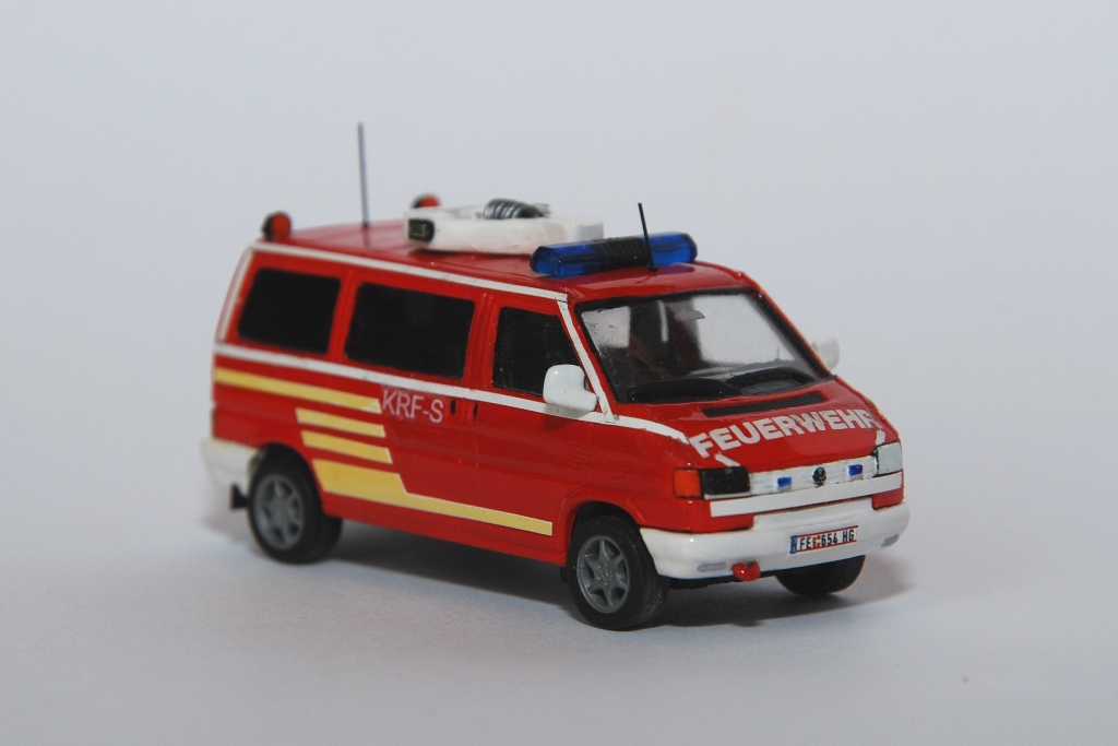 das hier vorgestellte Modell ist eines aus meiner Anfangszeit - sicher schon an die 10 Jahre alt! Das Original steht bei meiner ehemaligen Feuerwehr, der Hauptfeuerwache Villach, seit vielen Jahren (2001) als KRF-S (intern BFZ-Bergefahrzeug) im Einsatzdienst und rückt als Erstangriffsfahrzeug bei Verkehrsunfällen aus. Das Fahrzeug ist auf einem VW T4 Transporter aufgebaut, die hydraulische Anlage wurde von einer örtlichen Firma aufgebaut, der Fahrzeug-Innenausbau erfolgte in der feuerwehreigenen Werkstätte. Als Besonderheit weist das Fahrzeug einen Nightscan-Lichtmast am Dach auf, welcher per Fernsteuerung bedient werden kann. Im Heck befinden sich hydraulische Rettungsgeräte, wobei Schere, Spreizer und Rettungszylinder zeitgleich betrieben werden können, da sie über eine im Fahrzeug eingebaute Hydraulikpumpe gespeist werden, und nicht über ein externes Aggregat! Das Fahreug Rückt im Rahmen der SET-Bereitschaft mit einer Besatzung von 1:2 aus;