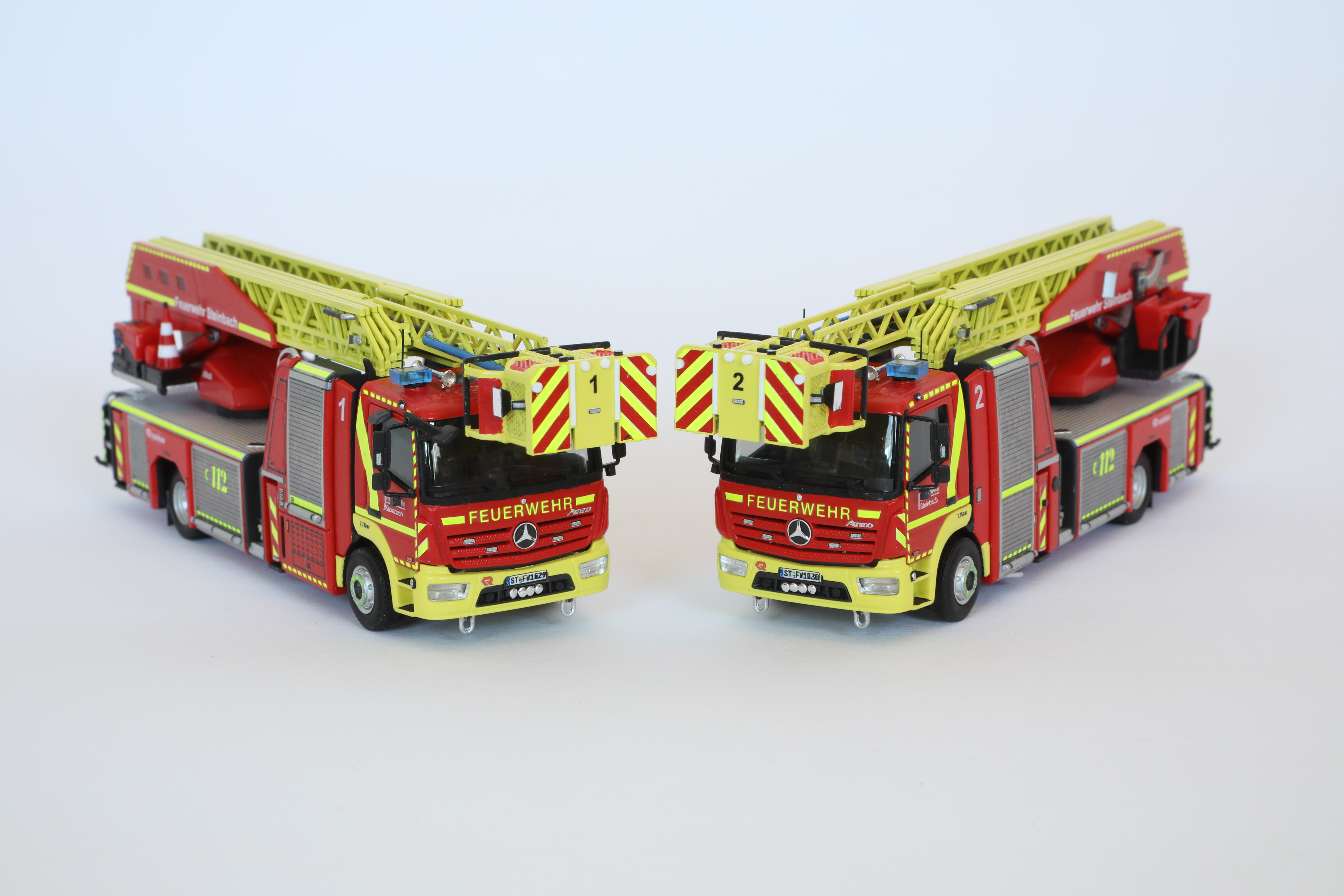 trotz der aktuellen Lage in Deutschland kann sich die Berufsfeuerwehr Steinbach über gleich zwei neue Drehleitern vom Typ Rosenbauer XS3.0 auf Mercedes Benz Atego freuen. Eigentlich sollte eine Live Vorstellung zur Intermodellbau auf dem Stammtisch stattfinden, das ist leider nun hinfällig und so gibt es jetzt schon was zum gucken. Beide Drehleitern werden in Zukunft von der Berufsfeuerwehr auf den Feuerwachen 1 und 2 eingesetzt, wobei die Feuerwache 2 erst zum Sommer in Betrieb geht. Die bisherige Leiter der Feuerwache 1 ebenfalls von Rosenbauer aus dem Jahr 2010 geht an die Freiwillige Feuerwehr über wo sie eine Drehleiter aus dem Jahr 2000 in den Ruhestand schick. Beide neuen Drehleitern wurden im neuen Farbschema der Feuerwehr Steinbach beschafft (Verkehrsrot mit Schwefelgelb) und durchbrechen so den Trend zu Anthraziten Drehleitern. Da die Sicherheit an erster Stelle steht wurde neben der Lackierung auch wieder das bekannte auffällige Beklebungsdesign gewählt, eine Zeitgemäße Blaulichtanlage rundet das Gesamtpaket ab. Da ab dem Stichwort Technische Hilfe 1 immer der komplette Löschzug mit ausrückt befindet sich zusätzlich auf den Drehleitern größere Lübecker Hütchen welche auch für Autobahn Einsätze geeignet sind. Ansonsten gibt es keine größeren Besonderheiten zu erwähnen.