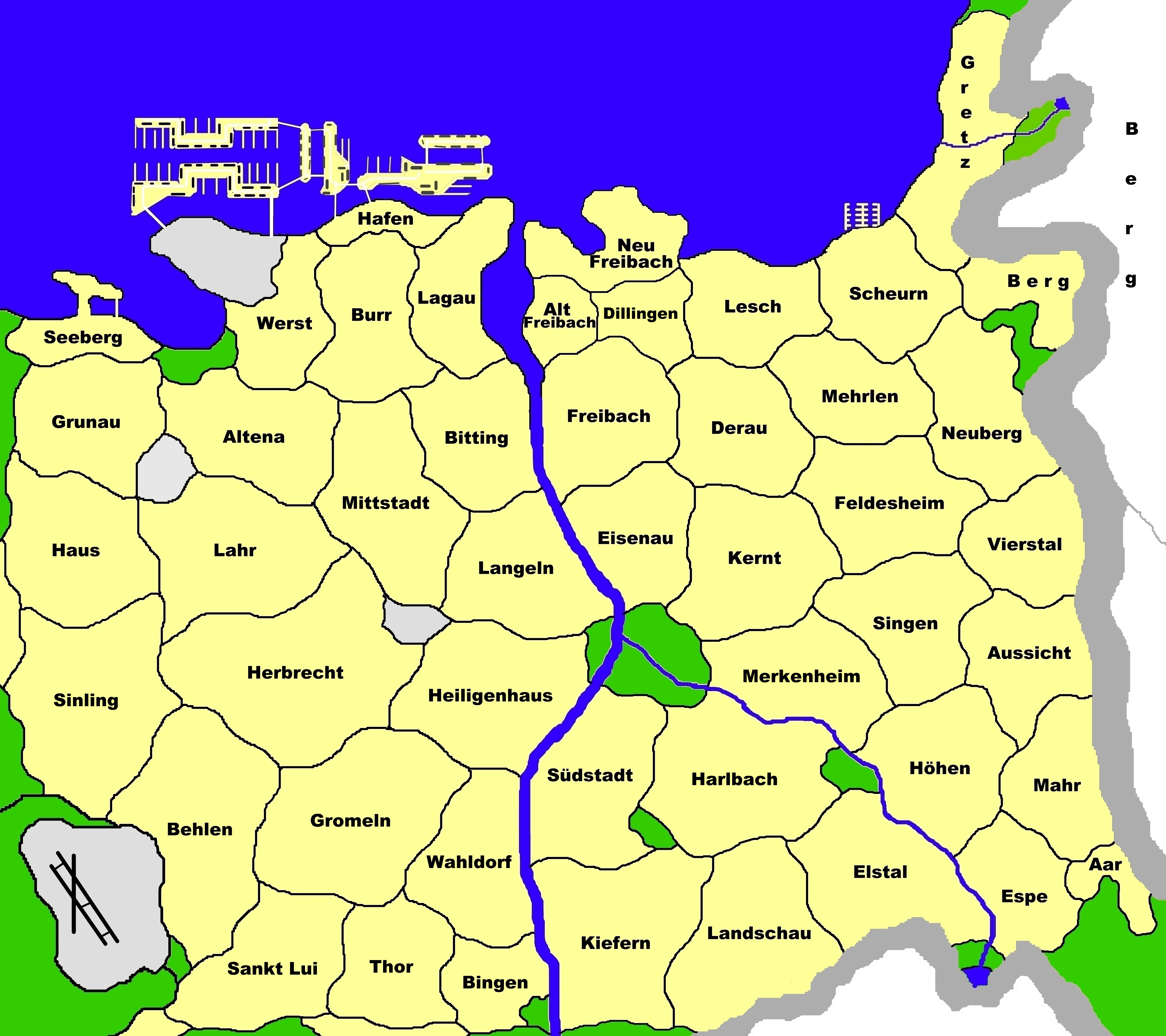 Die Stadt Freibach besteht aus 48 Stadtteilen (ohne Flughafen-City und dem Chemischen Technologie Conzern; kurz CeTeC) mit ca. 930.000 Einwohner und ca. 125.000 Besuchern/täglich.