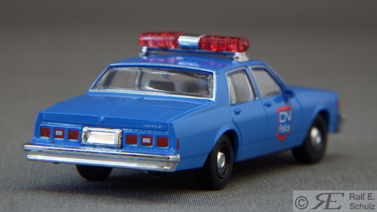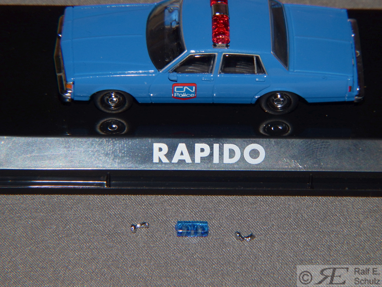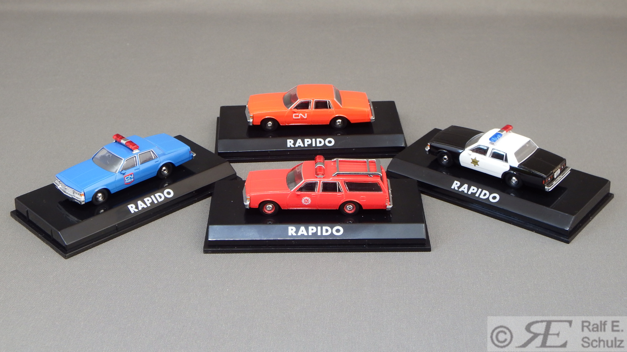 Heutzutage sind (teure) Lizenzen für Modellhersteller ein großes Problem, deshalb hat Rapido zwar immerhin die Lizenz von GM (General Motors), aber nicht für angedachte Behördenvorbilder. Vermutlich aus diesem Grund wurden diese Modelle vergleichsweise neutral gehalten, obwohl sich davon welche ziemlich klar am Aussehen der Polizei von New York (https://rapidotrains.com/ho-chevrolet-i ... -blue.html) und Chicago (https://rapidotrains.com/ho-chevrolet-i ... white.html) orientieren, sowie vornehmlich an kalifornischen Vorbildern wie z.B. der CHP (https://rapidotrains.com/ho-chevrolet-i ... black.html). Deutlich konkreter kommen die Fahrzeuge der Amtrak Police (https://rapidotrains.com/ho-chevrolet-i ... olice.html) und der CN Police (Canadian National Railway Company Police - https://rapidotrains.com/ho-chevrolet-i ... olice.html). Dazu noch ein Wartungsfahrzeug Fahrzeug der CN (https://rapidotrains.com/ho-chevrolet-i ... nance.html), ein neutrales gelbes Taxi (https://rapidotrains.com/ho-chevrolet-i ... -taxi.html) und ein "Fire Chief" als Kombi (https://rapidotrains.com/ho-chevrolet-i ... chief.html). Dass die meisten wie gesagt vergleichsweise neutral gestaltet sind, kommt Modell(um)bauern durchaus gelegen...