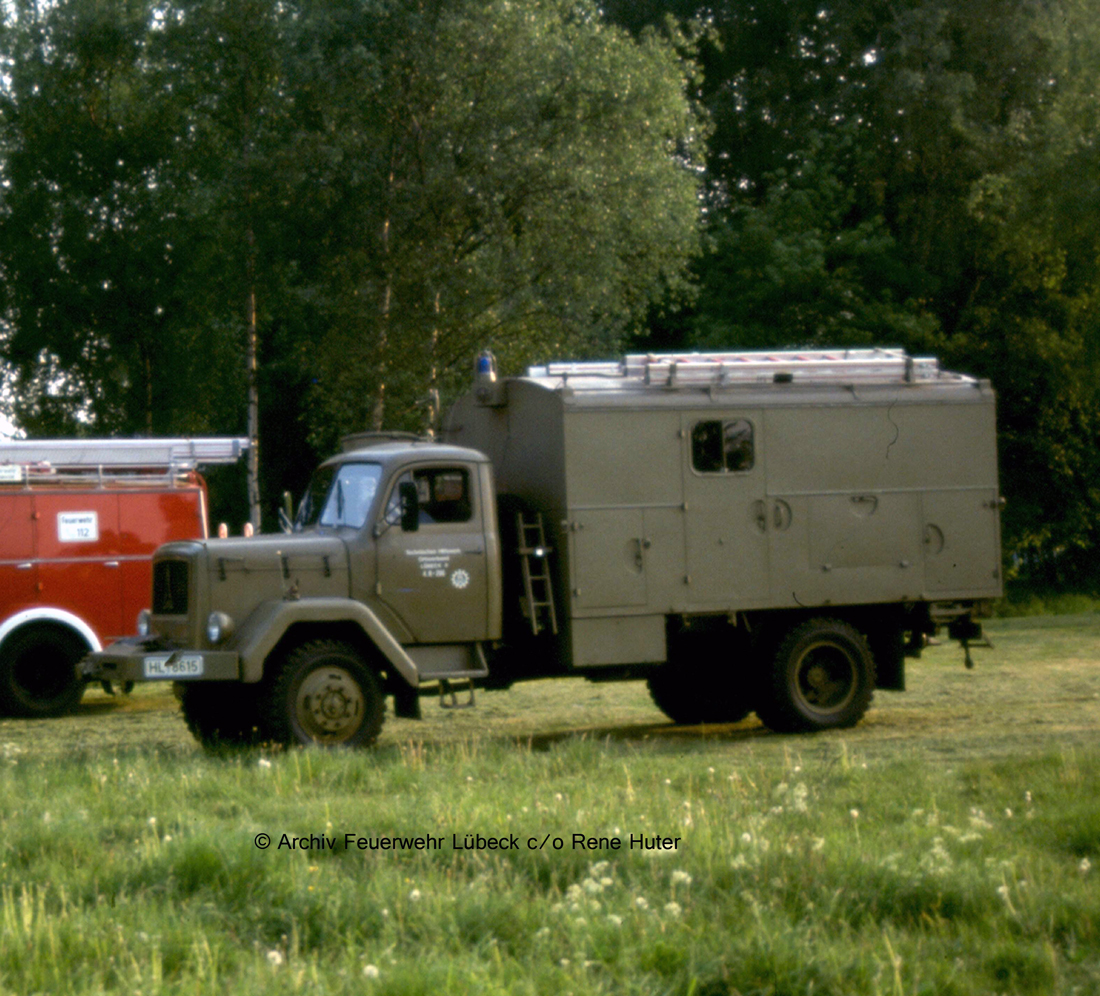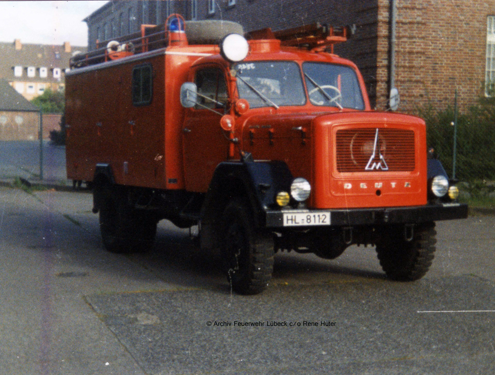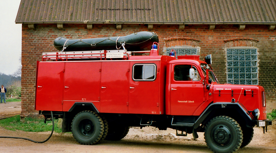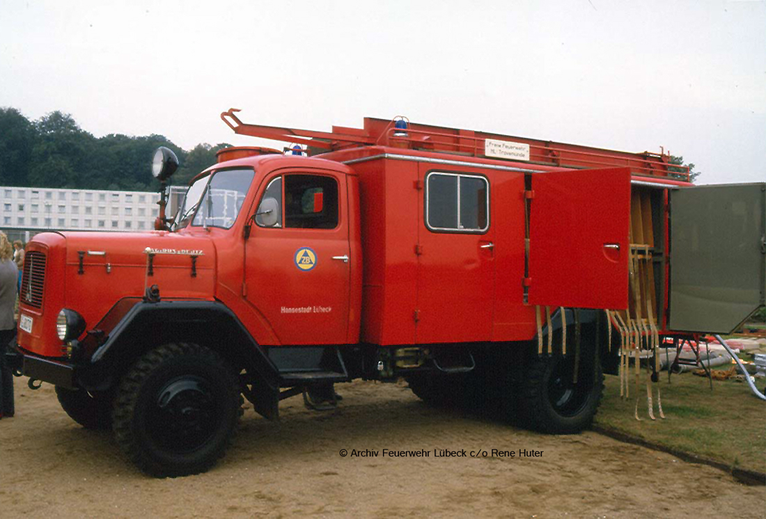 Das TLF 16 der FF Travemünde wurde vom Bund übernommen, umlackiert und fuhr dann mit städtischen Kennzeichen. Besonderheit waren die weißen Absetzungen am Heck.