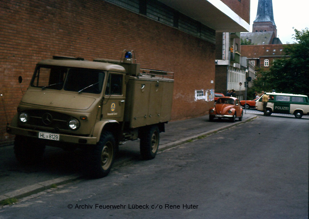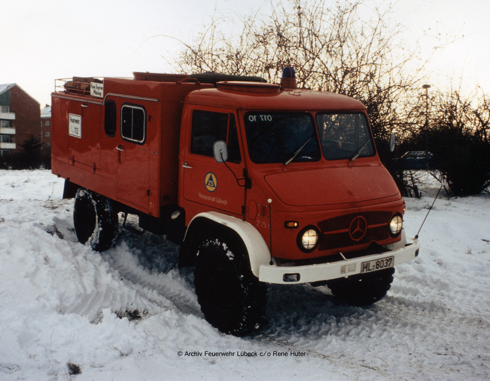 1980 wurde dieser MB Unimog 416 als 4-Tragen-KTW in Dienst gestellt. Die Fahrzeuge wurden nach der Schneekatastrophe 1978/79 für Schleswig-Holstein für jeden Landkreis(außer Kreis Ostholstein) und jede kreisfreie Stadt beschafft. Nach der Schneekatastrophe merkte man, dass es an allradgetriebenen Fahrzeugen, besonders im Rettungsdienst, fehlte. Dafür wurden diese Fahrzeuge beschafft. Mit einer Seilwinde (30 kN Zugkraft) war auch eine Eigenbergung möglich. Der Lübecker Unimog wurde in seiner Dienstzeit zum GW-Großunfall umgebaut und wurde im Januar 2015 in seinen wohlverdienten Ruhestand geschickt.