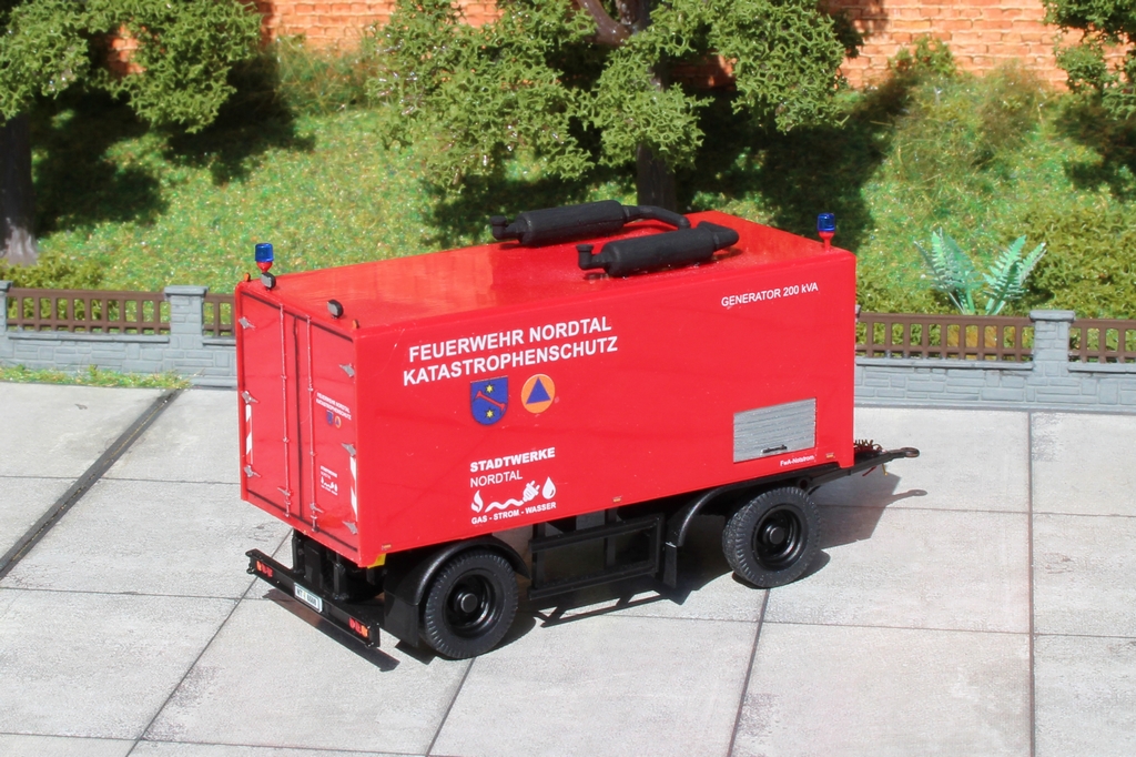 In den Kofferaufbau wurden vorne und seitlich entsprechende Öffnungen für das Lüftungsgitter und die beiden Rolloverschlüsse eingearbeitet. Das Lüftungsgitter ist aus einer Strukturplatte gebaut, welche mit einem Rahmen aus 1x1 mm Viereckprofil versehen wurde. Auf dem Dach fand eine Auspuffanlage von einem Preiser Flugfeldlöschfahrzeug ihren Platz. Das Fahrgestell des Anhängers stammt von Brekina und wurde etwas "modernisiert". U.a. wurden Heck- und Seitenunterfahrschutz sowie Schmutzfänger angebracht. Neue Reifen, Radkeile, Versorgungsleitungen und Decals vervollständigen den Anhänger.