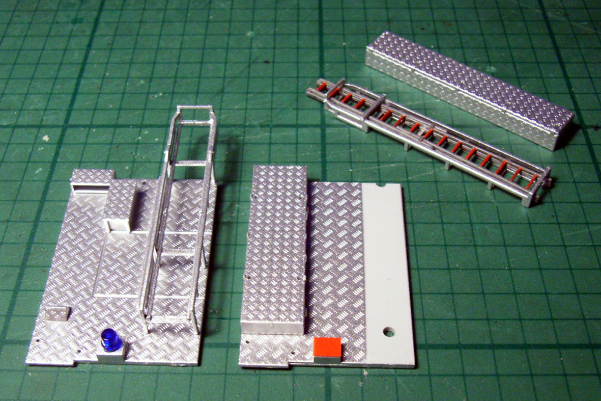 Vom LF 16/12 kommt der zukünftige linke Dachkasten des VLF; er trägt aber eigentlich die Schiebleiter-Halterung. Also muß auch die umgebaut werden - und zwar "auf Steckleiter"! Und die ist/sind auch schon fertig :D (mit rot lackierten Sprossen)!