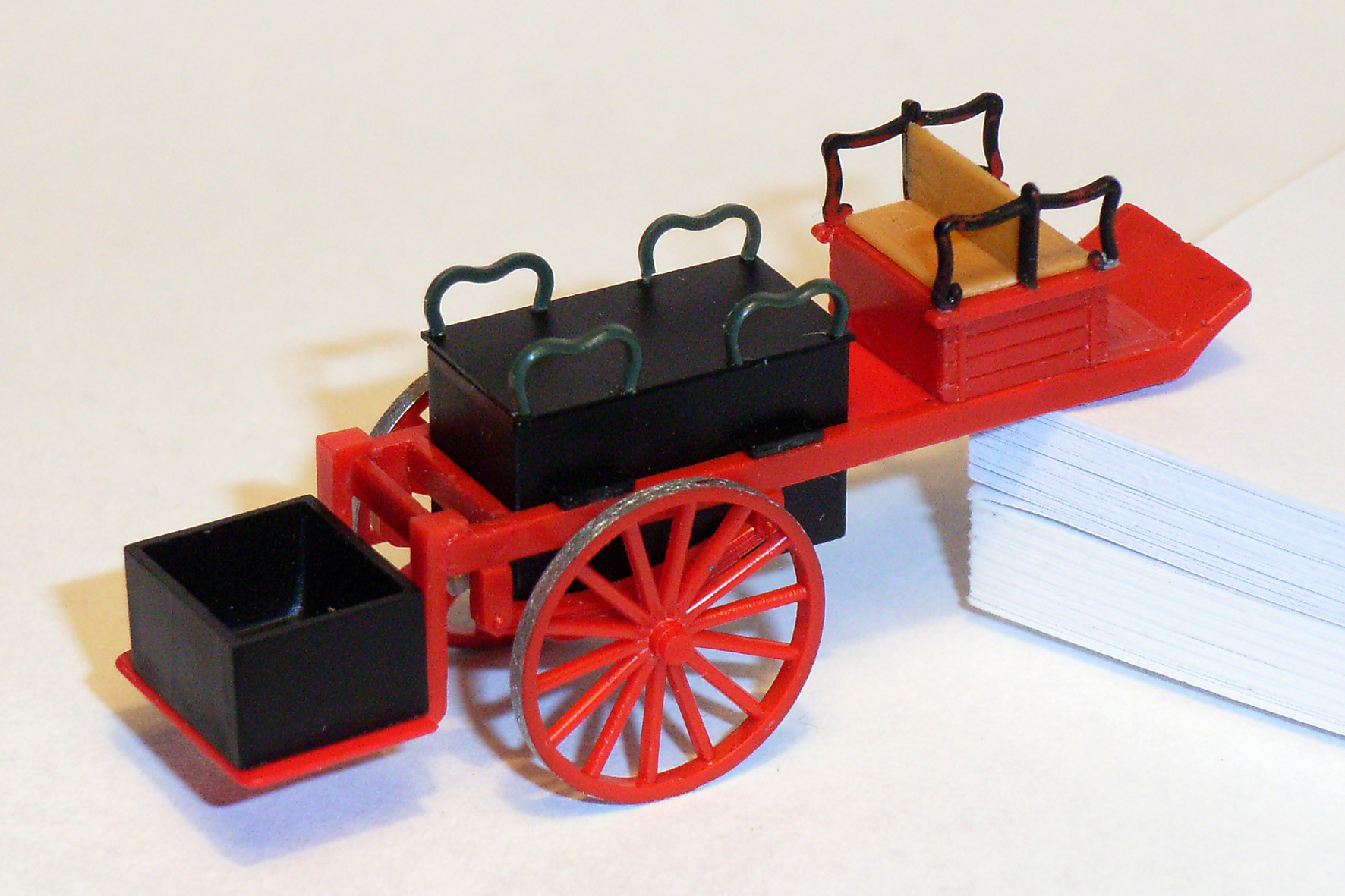 Auch wenn damals manche Feuerwehrfahrzeuge "vom Sattel aus" gelenkt wurden und die Mannschaft tlw. im Stehen mitfahren musste, mein Universal-Löschzug bekommt neue Sitzgelegenheiten für insg. acht Mann: Die vorderen Sitzbänke stammen vom Preiser-Kohlenwagen, die hinteren sind auf dem Legost..., äääh, Wassertank angeordnet.