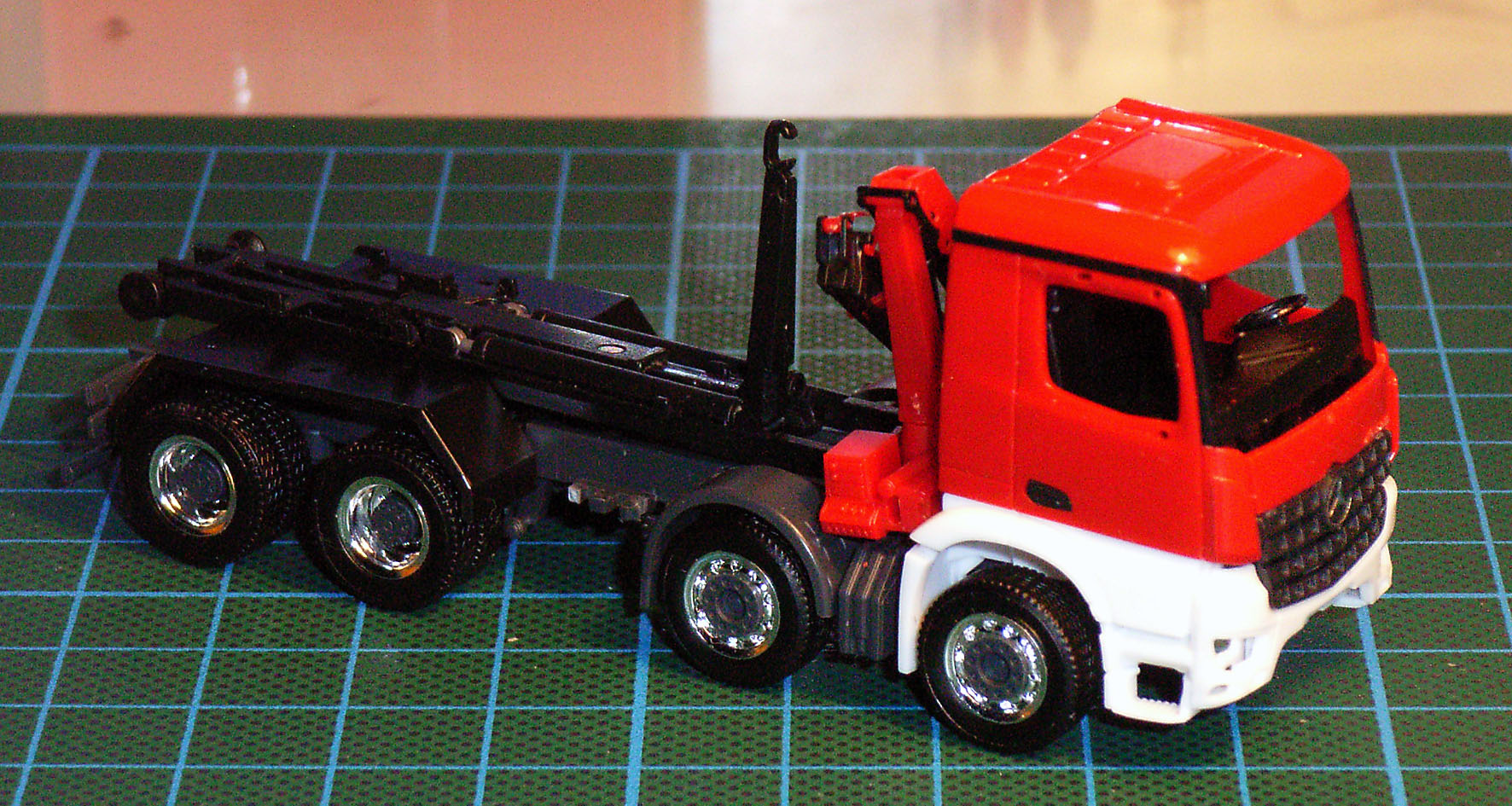 Man nehme ein MiniKit Empl-ULF (Herpa 013055), einen vierachsigen Arocs-Betonmischer von Herpa (Farbe egal), einen THW-Kipper (Herpa 092562), einen Palfinger-Ladekran von Herpa (aber in rot!) und die ältere Wechsellader-Kinematik wie sie schon hundertfach von Herpa verwendet wurde.