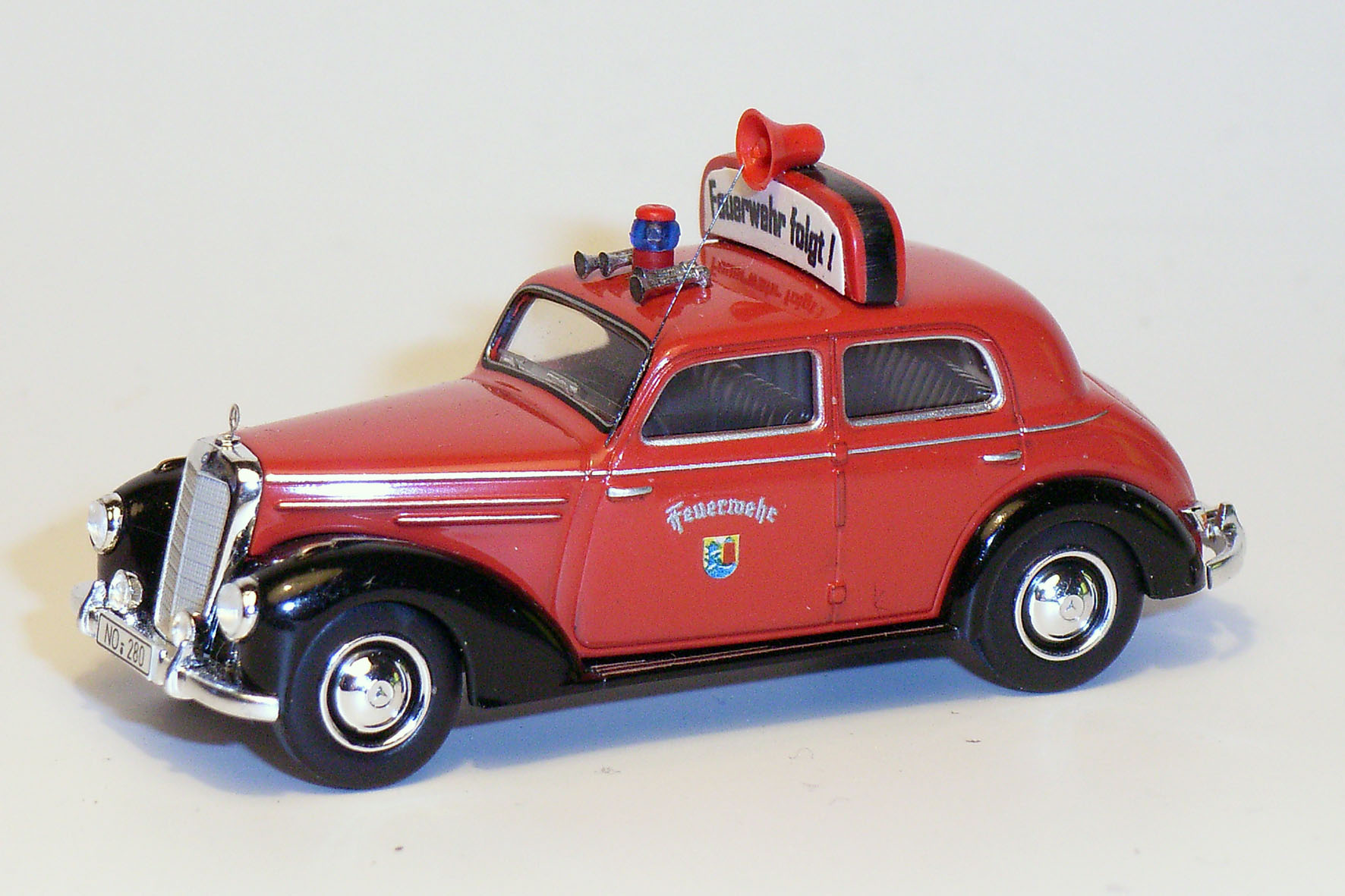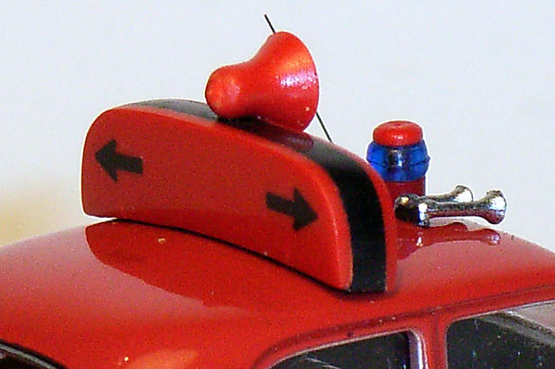 Wie schon im Vorbildthread nachzulesen ist, gab es in den 50er Jahren bei einigen Feuerwehren sog. Vorfahrwagen mit tlw. überdimensionierten Dachschildern - so z.B. in Remscheid, Osnabrück, Essen, Düsseldorf, Solingen und Köln.