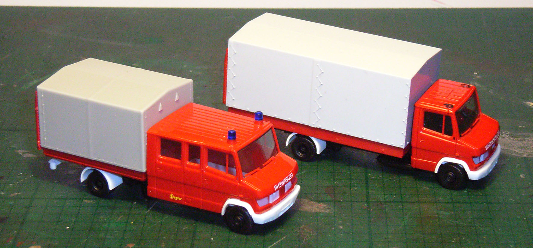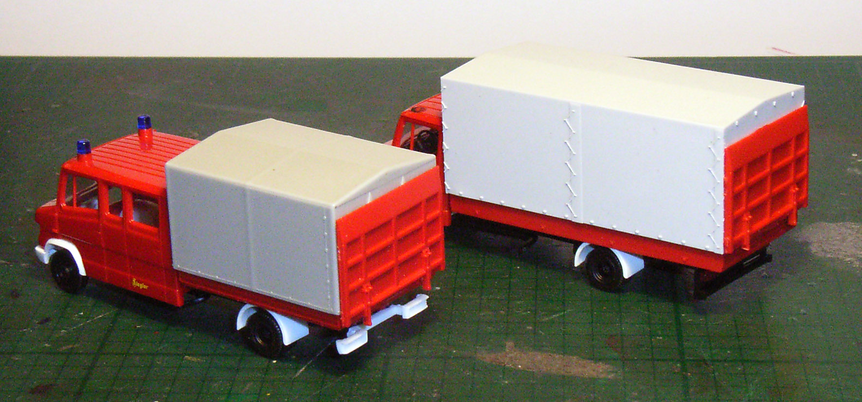 Der BF-Laster basiert auf dem Vario-Modell von AWM (s.h. Fahrgestell, Pritsche, Plane) mit einer Kabine von Herpa und einer Ladebordwand von Roco. Sein freiwilliger Kollege soll aus Gruppenkabine, Fahrgestell und Ladefläche von Herpa sowie ebenfalls einer Roco-LBW entstehen. Eine erste Stellprobe sieht dann so aus: