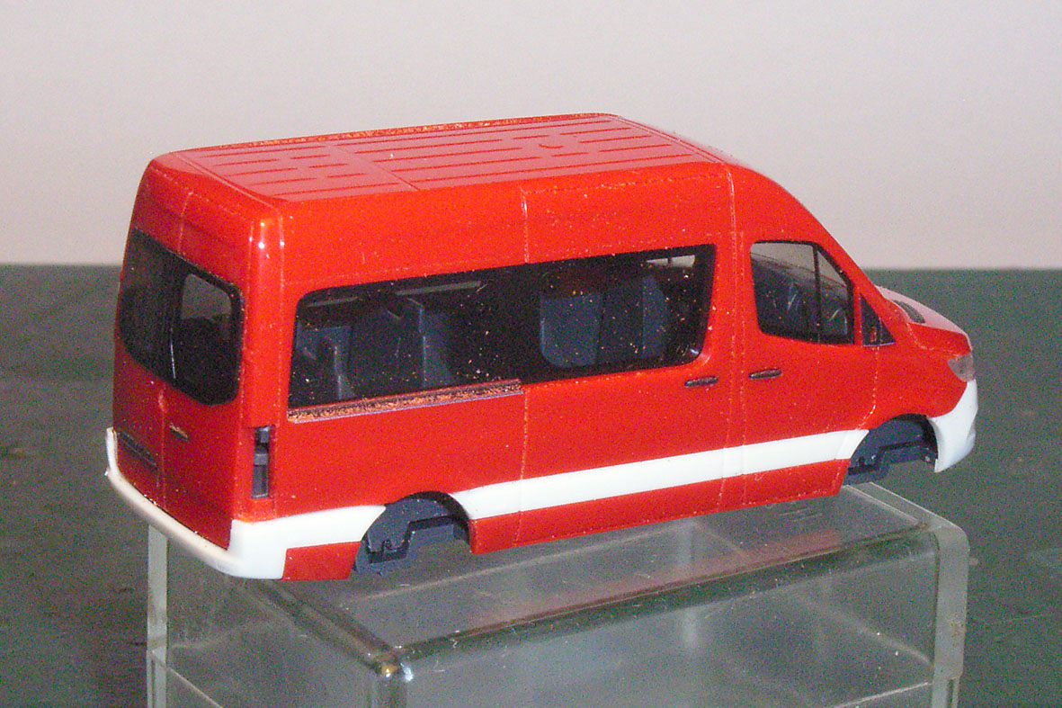 Meinereiner hat geschrieben: Man muss schon ein bisschen mogeln und die weiße Bodengruppe vom Vorgänger-Sprinter '13 verwenden. Die beim Sprinter '18 jetzt leider in die Karosserie integrierte Heckstoßstange muss natürlich mit Feile und Skalpell operativ entfernt und die Teile aus den div. Baujahren etwas (s.h. im Zehntelmillimeter-Bereich) einander angepasst werden.