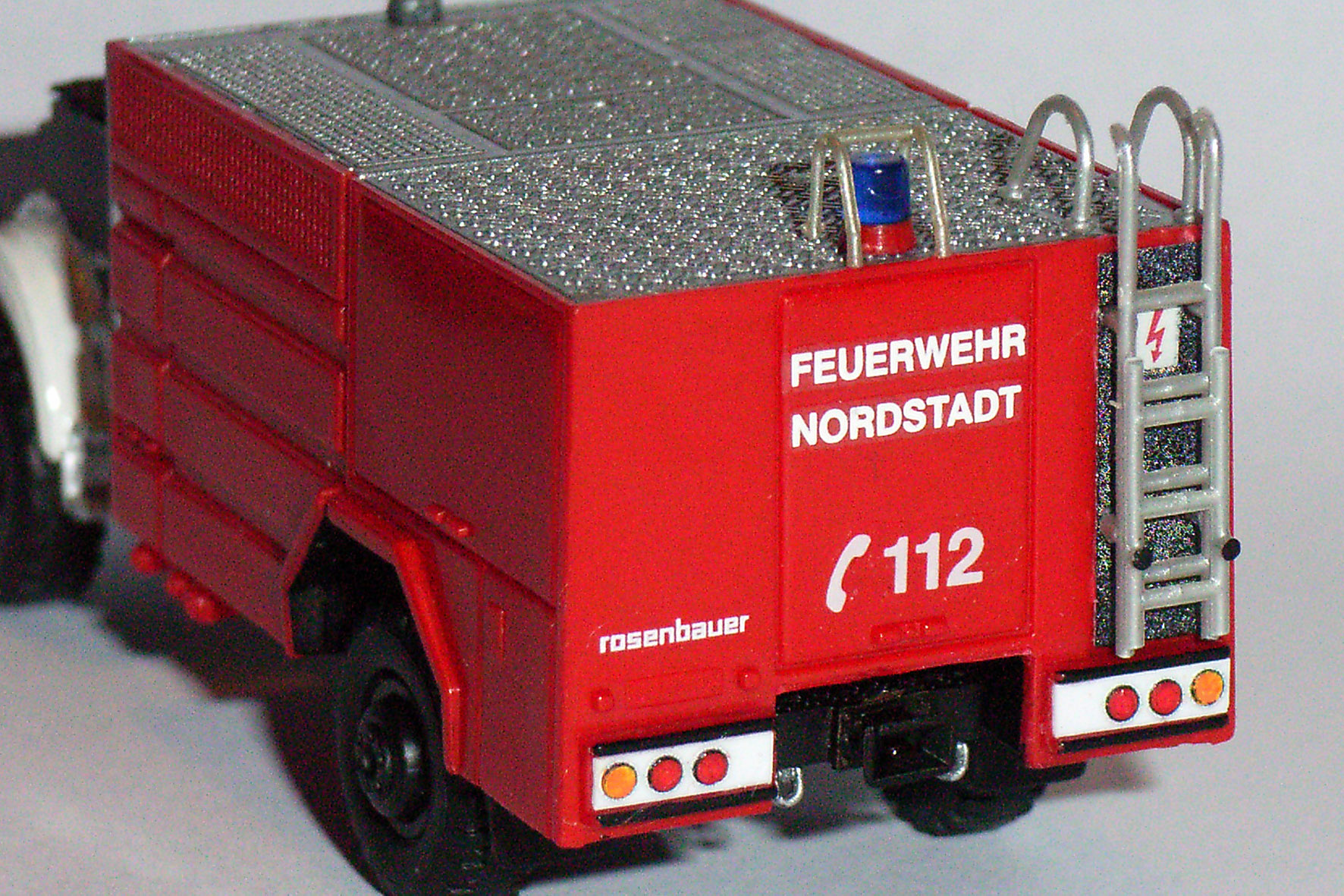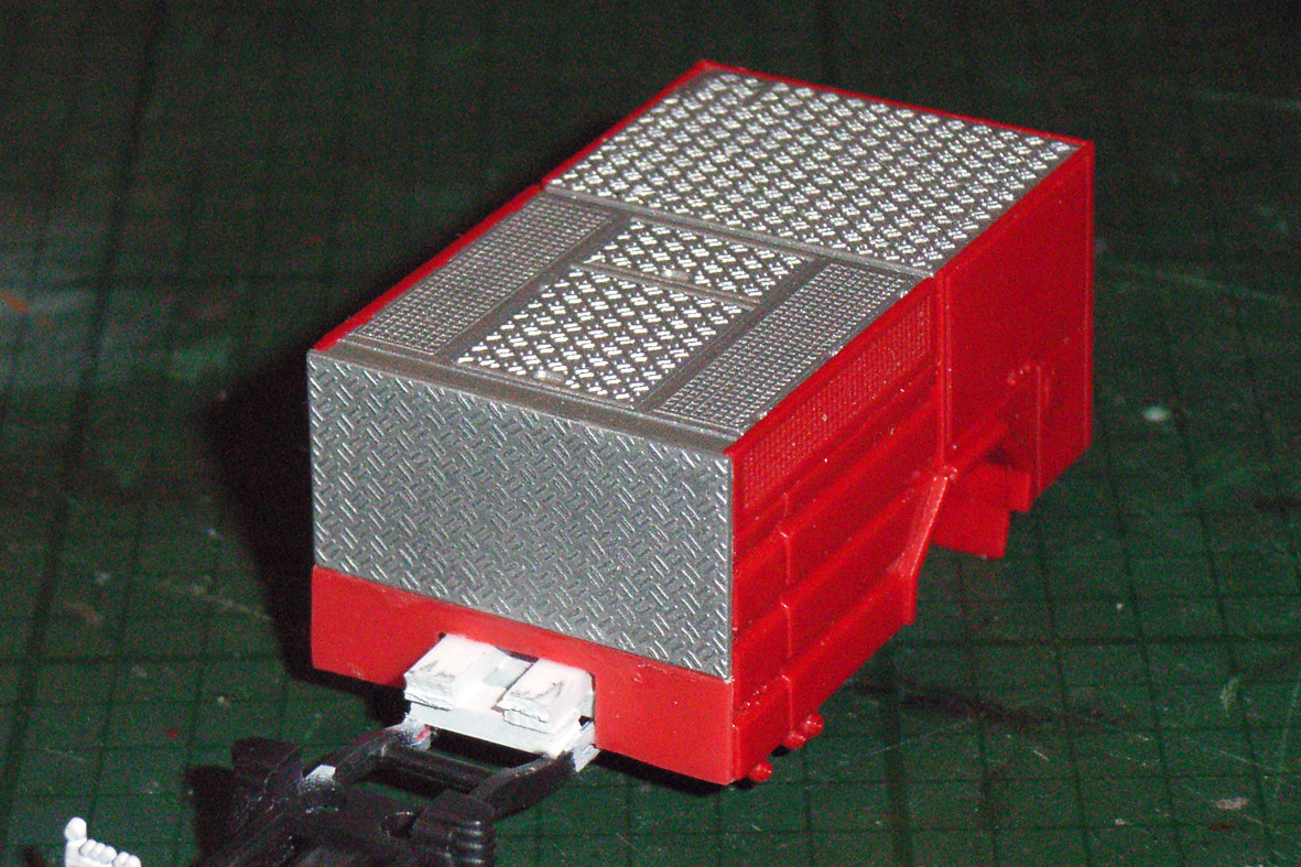 Apropos hinten: Ein schöner Rücken kann auch entzücken! :mrgreen: (...ist aber noch lange nicht komplett) Die Stiefelschutz-Folie hinter der Heckaufstiegsleiter sieht übrigens ohne Blitzlicht völlig gleichmäßig schwarz aus. Die weißen Flächen des Stoßfängers bestehen aus Evergreen-Profil, die Gummileisten wurden mit einem schwarzen Molotow-Stift nachgezogen und die Rückleuchten kamen von MMH, wurden aber auch mit Molotow bearbeitet.