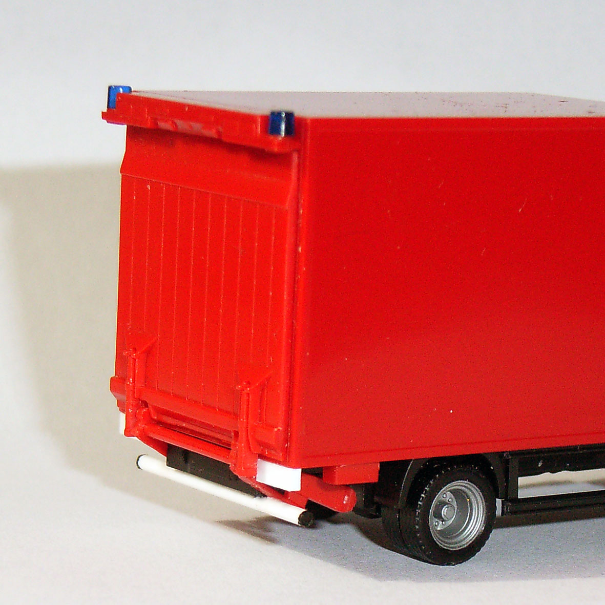 Die Breite der Ladebordwand habe ich an beiden Seiten um jeweils gute 2mm verringert und über der LBW eine RTW-Leuchteneinheit befestigt. Außerdem ist der Sprinter jetzt auf der Hinterachse zwillingsbereift, weil ihm irgendjemand den rückwärtigen Teil des MAN-Fahrgestells transplantiert hat! :wink: