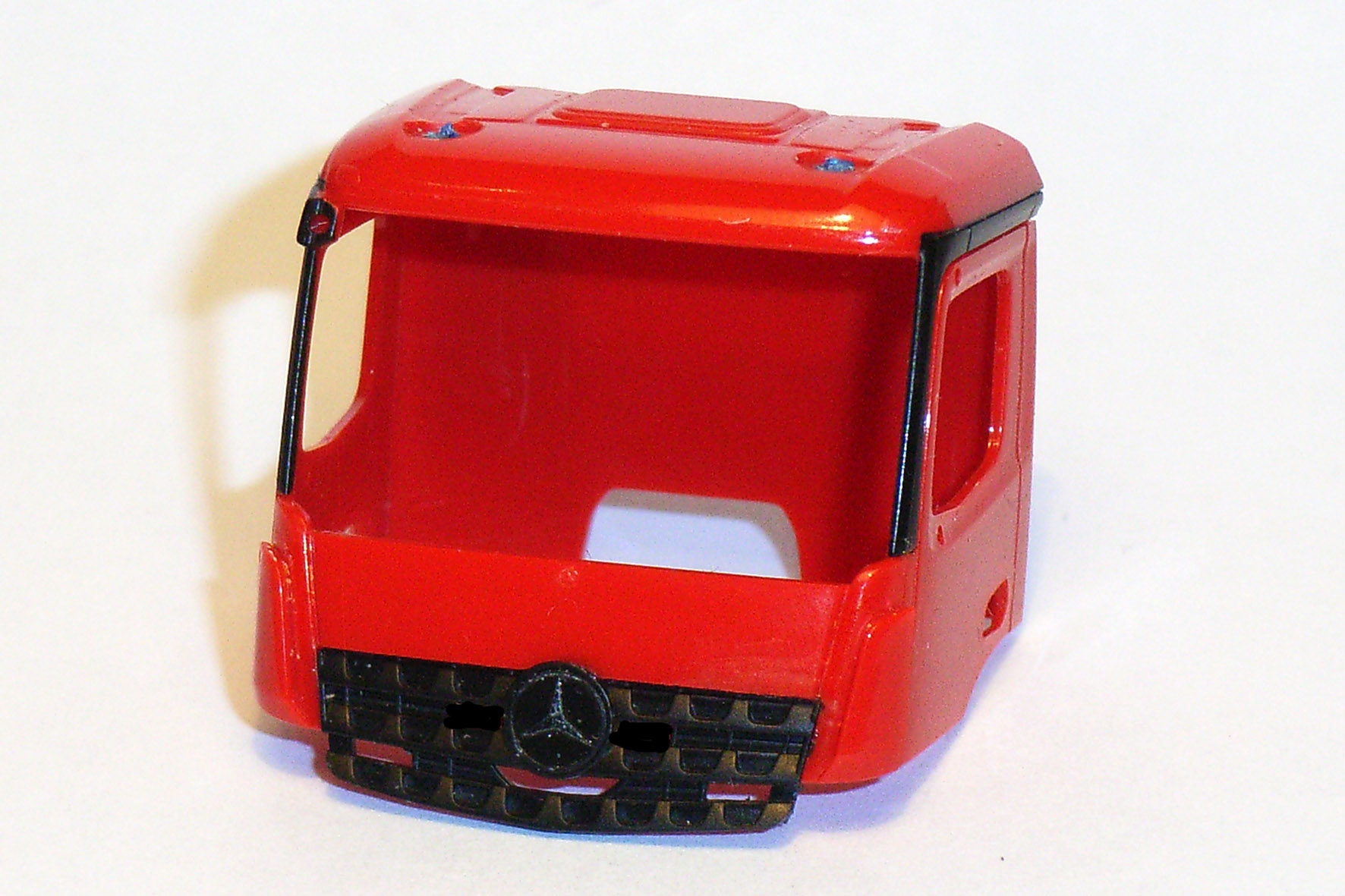 Wie im Startbeitrag geschrieben, gibt es leider nur die flache Antos S-Kabine von Herpa in rot - also muss der Grill eines großen Arocs um eine Zahnspange reduziert und den Radien der Antos-Hütte angepasst werden: