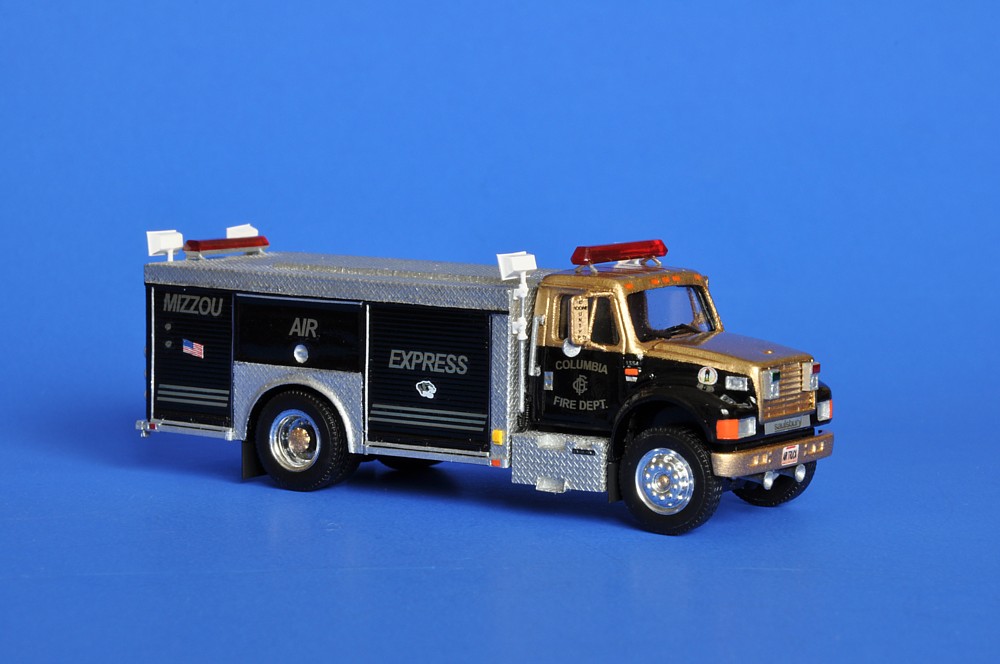 Vom IHC-Modell habe ich hier nur die Kabine und das Chassis übernommen, das erheblich gekürzt werden mußte. Die Scheinwerfer der Kabine wurden verschlossen und mit Plastikplatten neu gestaltet. Die Spiegel entstanden aus Draht und der Balken auf dem Dach wurde selbst gefeilt.