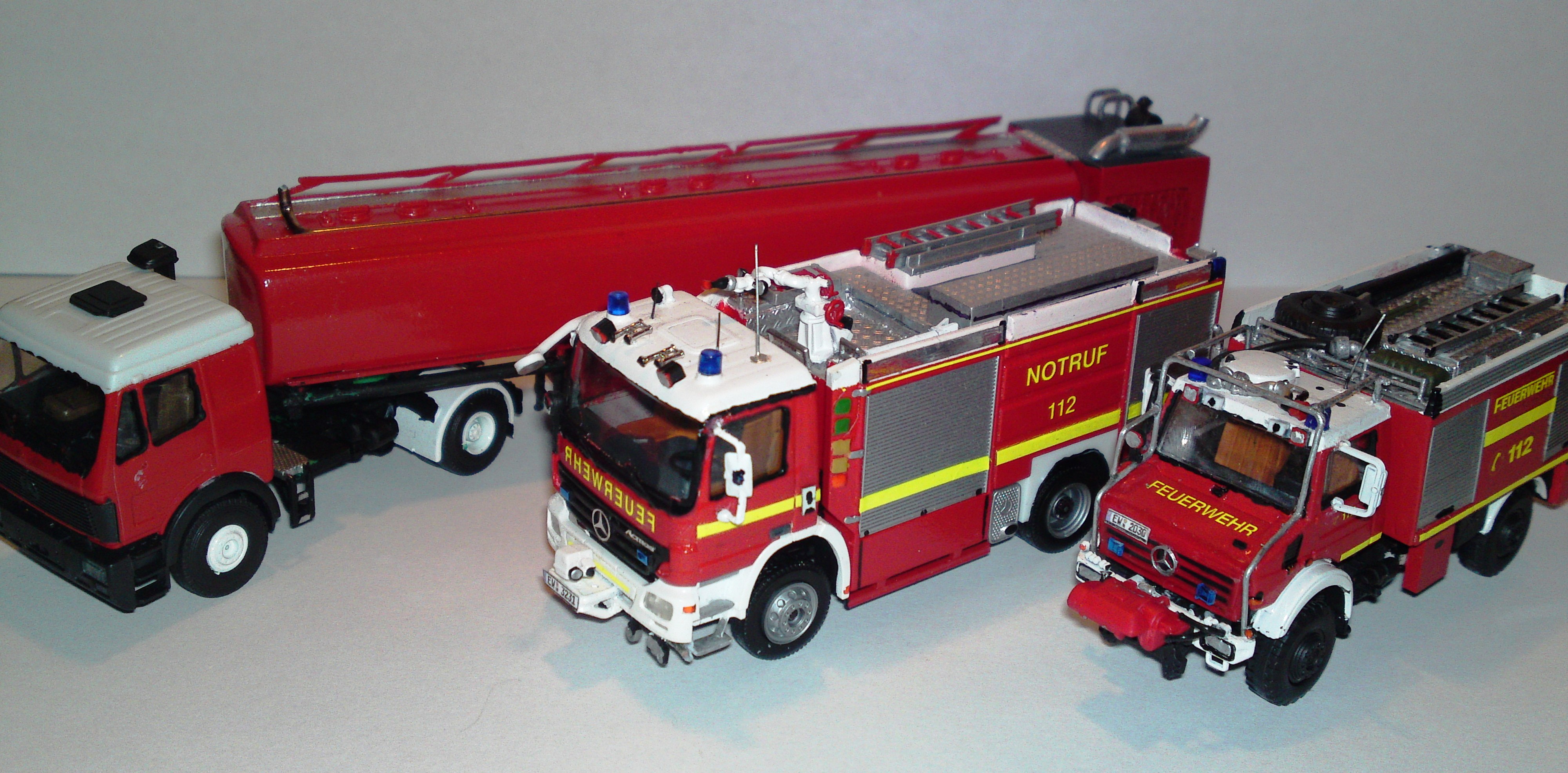 v.l.n.r.: GTLF-Sattelzug auf MB SK1834, TLF20/40-SL auf MB Actros, TLF 20/30-W auf Unimog U5000