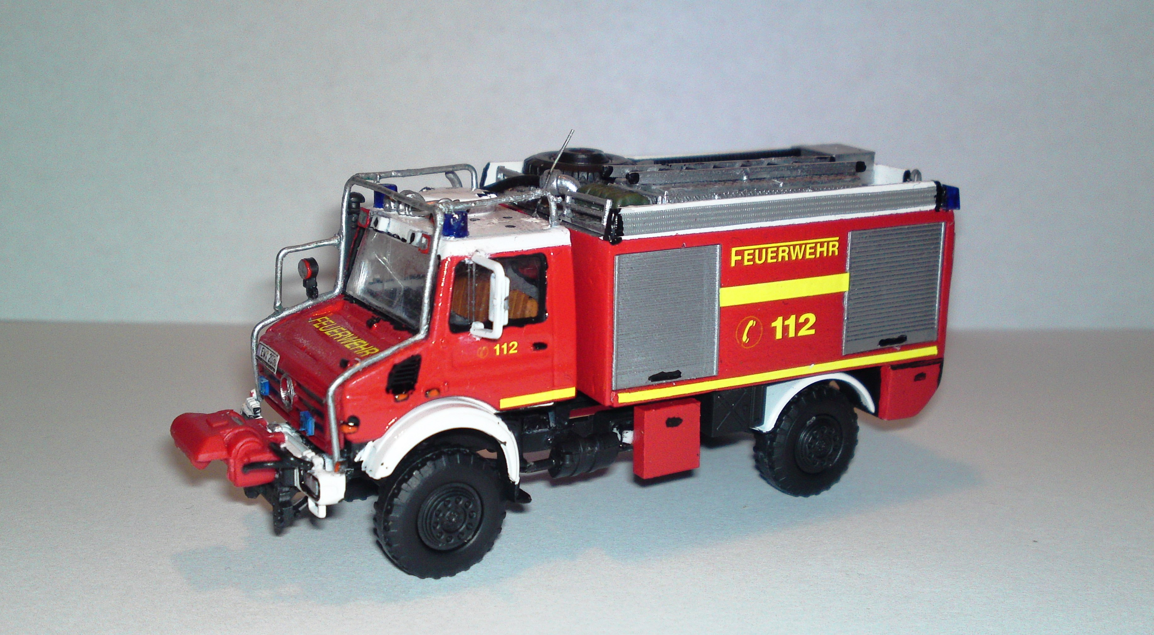 Nachdem ja das tropische Unimogfieber ausgebrochen ist musste auch ich der gleichen tun und einen Unimog in Dienst stellen. Vorbild natürlich D-dorf. Unomog mit aufbau von Ziegler. Modell: Kibri, Aufbau war ursprünglich mal ein HLF2000 von herpa welcher mit der bewärten Proxxon zum Kasten geschlitzt wurde, mittleren Rollo verkleidet, diverese Evergreenstreifen und der Aufbau war Fertig. Dachlulke von einem Rosskopf Tankwagen, Frontwinde aus der Schachtel, Werfer gekürzt vom HLF2000, Grabbelkistenplünderung