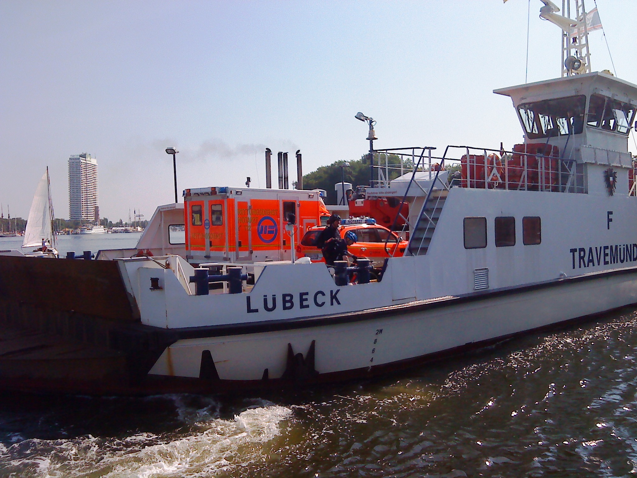 Jedenfalls fällt Priwall in den Zuständigkeitsbereich der BF-Wache 3 der BF Lübeck in Kücknitz. Und als ich mit meiner Family eines Morgens mit der Fähre auf die Travemünder Seite übersetzen wollte, hörte ich schon aus der Ferne Martinshörner....und ich dachte... die wollen doch nicht wirklich.... doch tatsächlich setzte der Zug aus LF16/12, DLK, RTW und NEF mit der Fähre über.