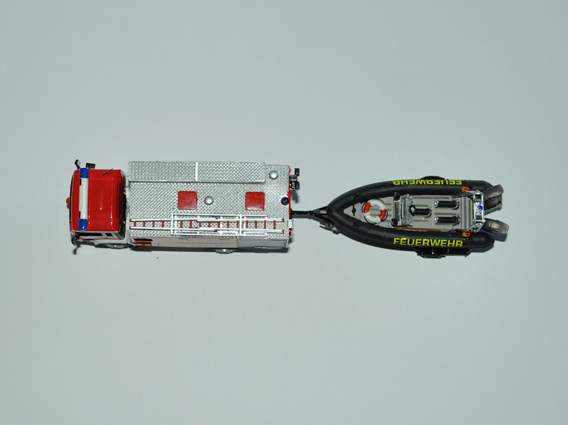 Das Boot ist von Boley und war in Deutschland zeitweise über Schuco im Vertrieb – als Feuerwehr und Polizeiversion hinter ziemlich gruseligen Actros.