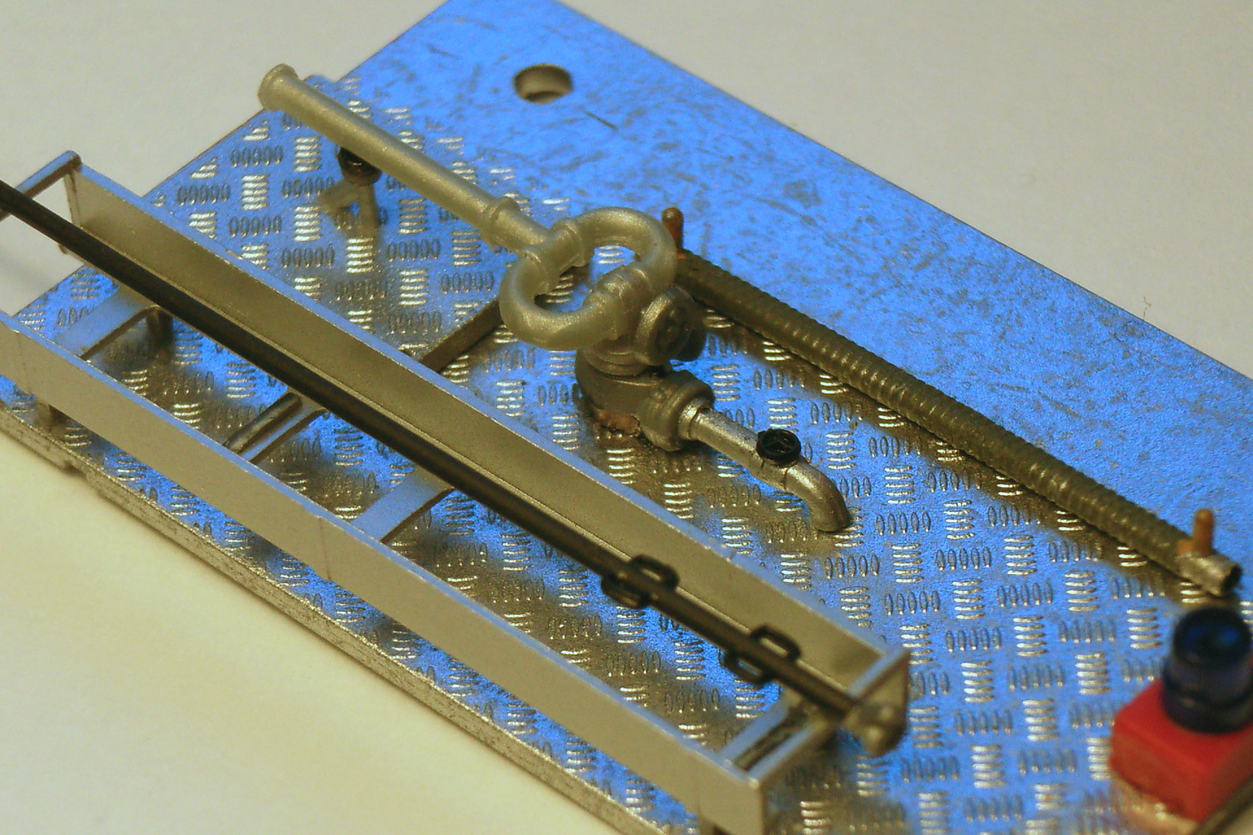 Die Umfeldbeleuchtung entstand aus den dreiteiligen Schlauchbrücken von Preiser: Die keilförmigen, geriffelten Seitenteile wurden entsprechend gekürzt, mattschwarz lackiert und mit silbernen Decalstreifen "erleuchtet".
