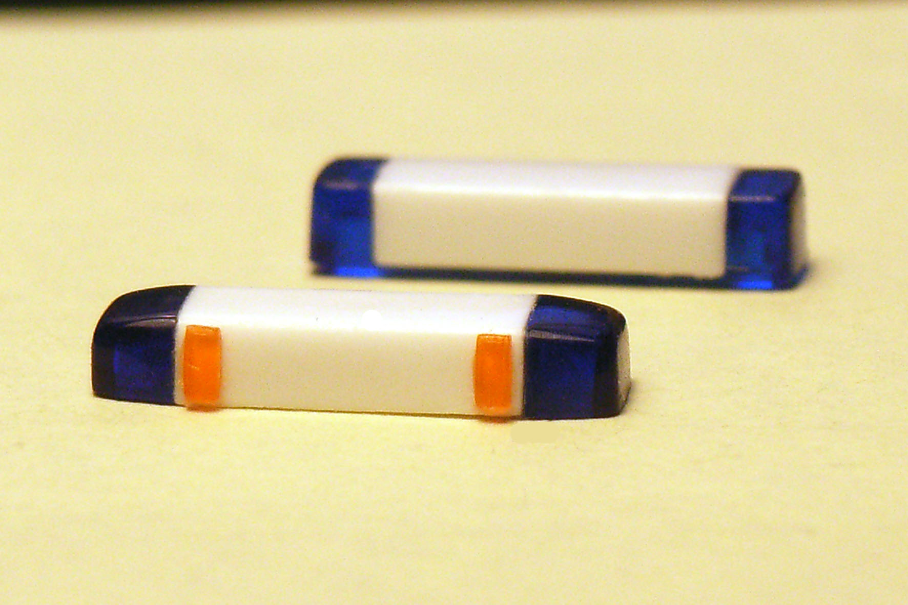 Man versucht, aus den bei Herpa und Rietze verfügbaren RTK 6 einen Blaulichtbalken zu fummeln, der wenigstens etwas vorbildgetreuer aussieht. Die Form der Herpa-RKL (052146) erinnert doch sehr an einen Schuhkarton: Viel zu eckig, gerade und kantig, dafür stimmen immerhin die Hauptabmessungen! (*¹)