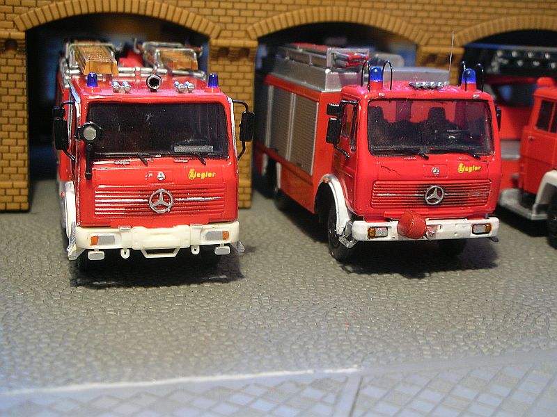 Na, gemerkt? Die Verstrebungen der Leiter sind natürlich völlig falsch. Das liegt daran, daß der Leiterpark, obschon auch von einer Metz-Leiter, so doch von einer Jahrzehnte neueren stammt: von Herpa seiner nämlich, zum Zwecke der DL25-Gewinnung um 2 Strebenfelder gekürzt -- auch weil das Ausgangsmodell eh beschädigt war. Hier nochmal die Basismodelle zum Vergleich: