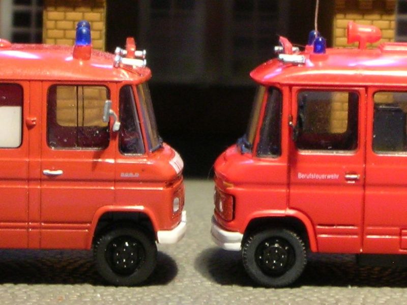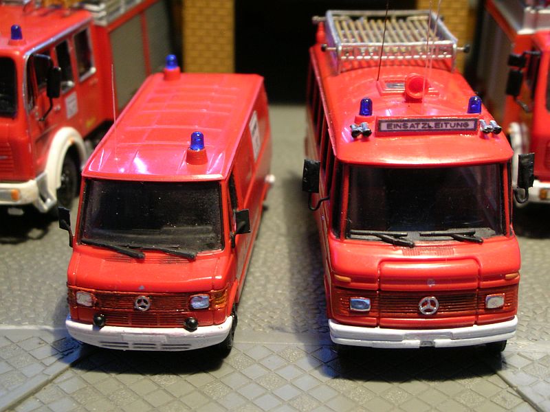 Mercedes "Düsseldorfer" 508 D von Preiser als ELW2, Mercedes "Bremer" 207 D von Herpa als ... tja, was eigentlich? Bis auf Weiteres nenne ich ihn mal "GW-Versorgung" aka Mädchen für alles, Vorschläge aus berufenerer Feder sind willkommen. Beschriftungen und Kennzeichen fehlen wie üblich noch.