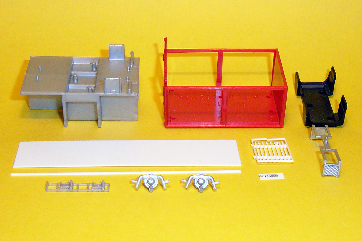 Die Bauteile des zweiachsigen MB NG-Fahrgestells von Preiser dürften hinlänglich bekannt sein; an ihnen werden alle Tanks, Kessel und das Auspuffendrohr abgetrennt um Platz für die neuen Riffelblech-Trittflächen zu schaffen (unter denen dann auch das Endrohr wieder zum Vorschein kommt). Ergänzt wird das Fahrgestell nur durch zwei Roco-Zusatzscheinwerfer für Nebelschlußleuchte und Rückfahrscheinwerfer sowie eine Rockinger-Anhängerkupplung von Weinert.