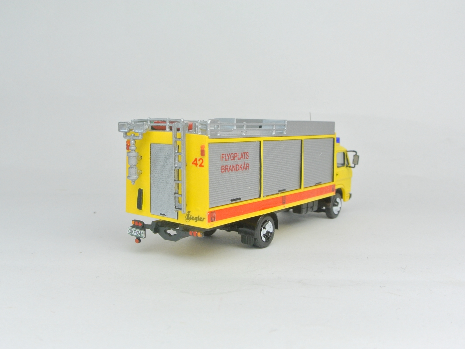 Für den Fall von Gefahrgut-Unfällen auf dem Flughafengelände hält man natürlich auch im hohen Norden passendes Gerät bereit. Die Ausrüstung, in etwa vergleichbar mit der eines deutschen GW-G, ist auf einem MAN-VW mit Ziegler-Aufbau verlastet, eine für schwedische Verhältnisse eher ungewöhnliche Zusammenstellung.