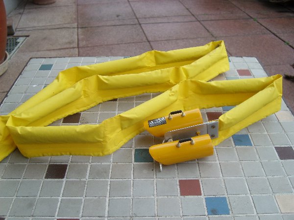 ein nicht mehr ganz neues Gerät aus Braunsweiler möchte ich hier einmal vorstellen. Es handelt sich um eine schwimmende Ölsperre für den Einsatz auf Flüssen und sehen. Insgesamt sind derzeit 4 m dieser Ölsperre vorhanden. Sie besteht aus Bügelfolie für das Beziehen von Modellflugzeugen, einigen Metern Befestigungskette für Wasschbeckenstöpsel (nicht rostend) als Gewicht sowie einer Schaumstoffschnur aus dem Baumarkt, die normalerweise zum Estrichlegen verwendet wird.