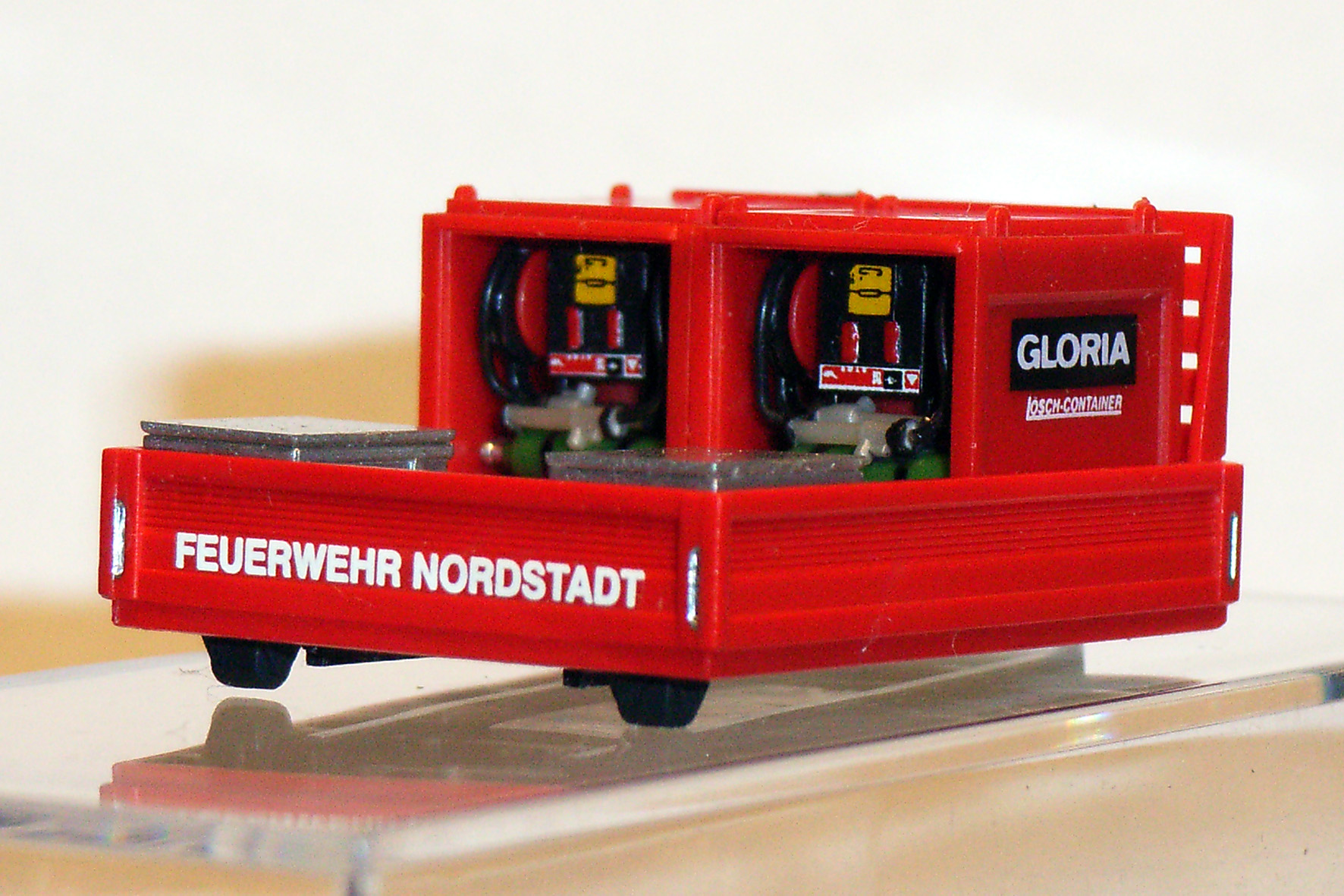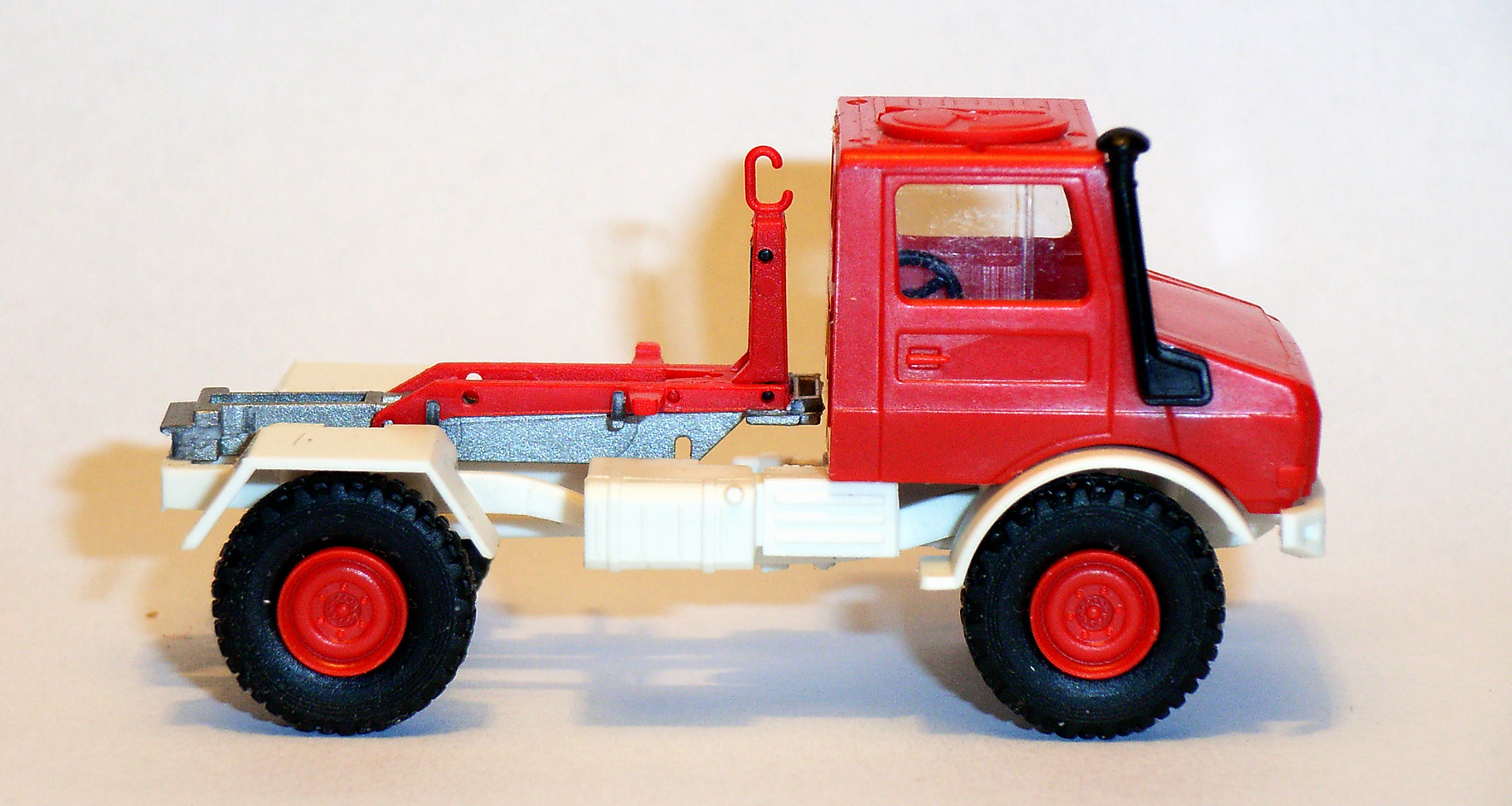 Einziges dafür geeignetes Fahrgestell ist m.E. ein Unimog! Nur der kann dem Hägglunds auch im etwas schwierigeren Gelände den benötigten Nachschub anliefern und passt von den Abmessungen her perfekt zu den relativ kleinen Behältern. Also wurden am Hinterwagen eines Hägglunds-WLF von Trident die überdimensionalen "Kotflügel" entfernt und die Atlas-Kinematik so weit an das Chassis eines Roco-Unimog U4000 angepasst, dass der AB einwandfrei abgesetzt werden kann.