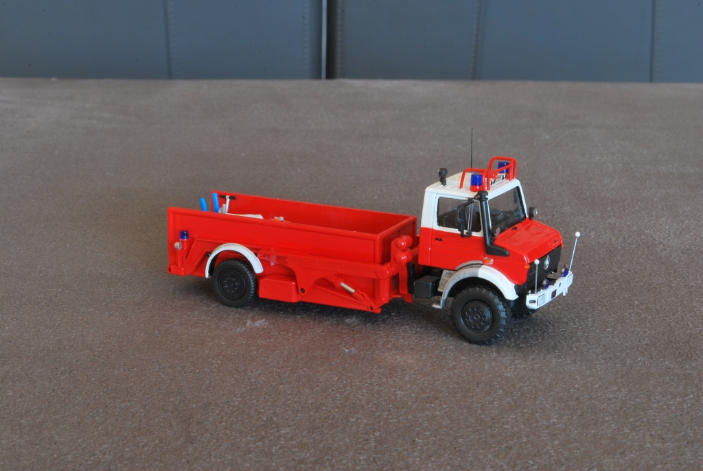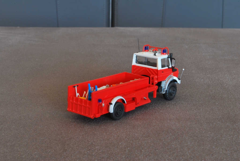 Als Grundmodell diente mir ein Bausatz von Kibri. Neben einer neuen Lackierung erhielt die Kabine Türgriffe aus KS-Profil - die hatten die Formenbauer wohl bei der Modellkonstruktion vergessen -, Blaulichter nebst Sockel und Martinhörner von Herpa, einen Lautsprecher von Preiser und Astabweiser aus Draht. Die Stoßstange wurde mit Peilstangen von Weinert und den obligatorischen blauen, runden Frontblinkern aus Straßsteinen aufgehübscht. Die Scheinwerfer in der Stoßstange habe ich mit Ätzgitter von FKS "unimogtypisch" vergittert.