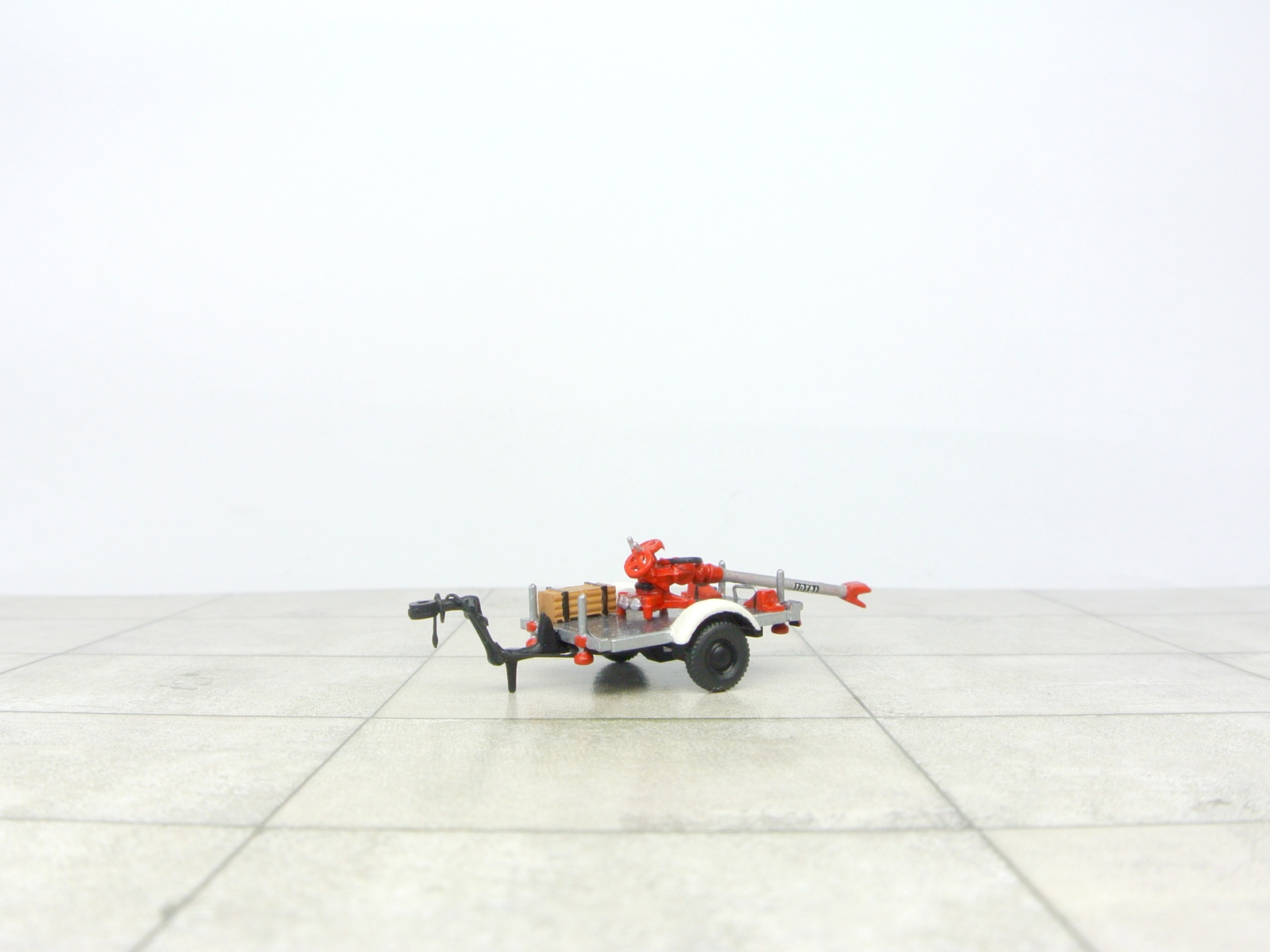 Das Modell entstand praktisch komplett aus Preiser-Teilen, plus ein bisschen Immergrün. Der Anhänger stammt aus dem Bausatz des 60 cm Flakscheinwerfers auf Sonderanhänger, garniert mit dem Aufbau des bekannten Ziegler-Schlauchanhängers. Durch das offene U des Anhängers ist die ganze Konstruktion nur ziemlich wackelig. Ich glaube, wenn ich den Hänger noch einmal bauen würde, dann kämen die B-Haspeln zur Stabilisierung wohl auf durchgehende Achsen.