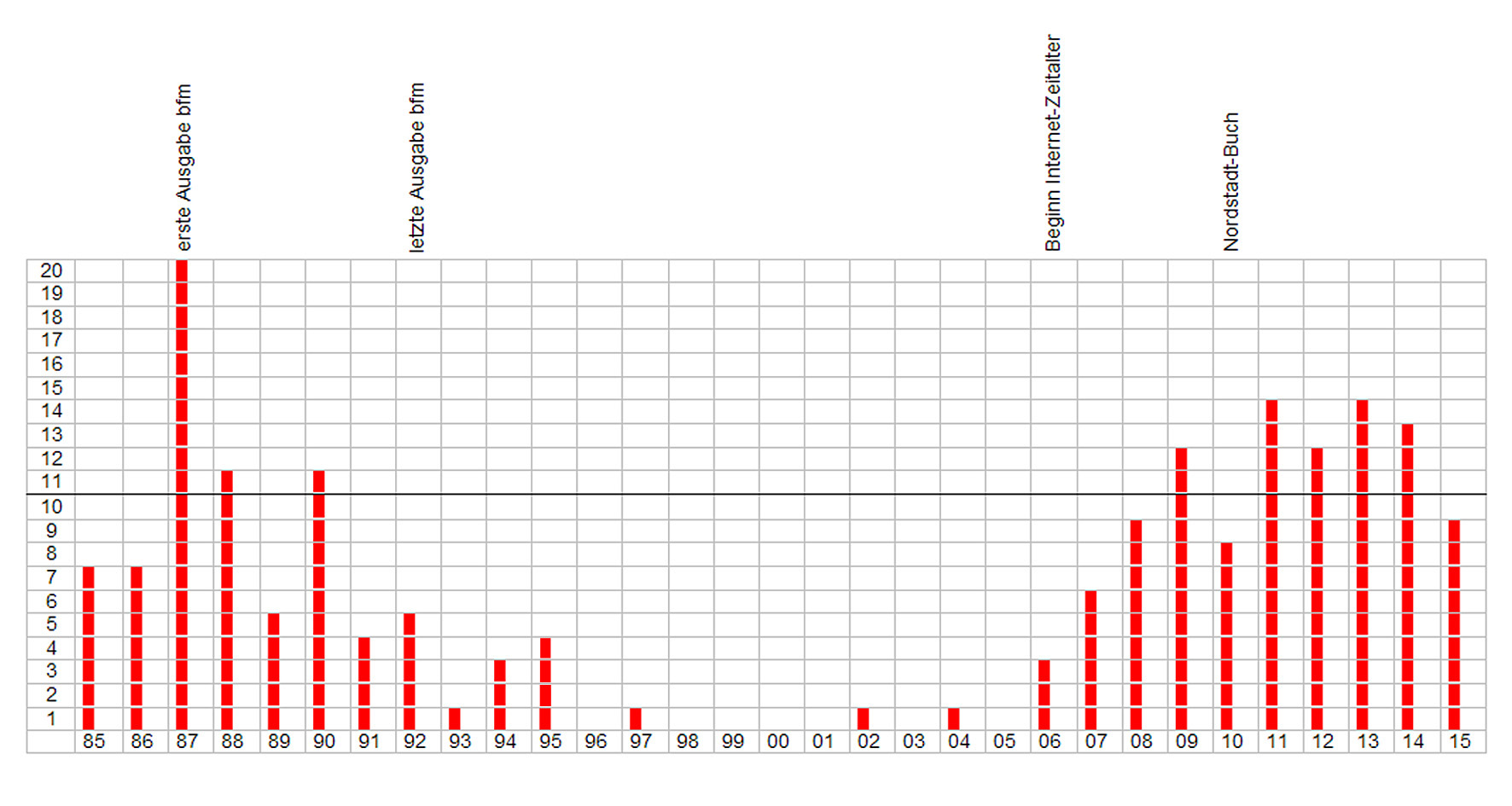 Da ich vorhin per PN gefragt wurde, ob mein "Ausstoß" an Modellen schon immer so hoch war (oder gar noch höher) und wieviel Nordstadt-Modelle es denn insgesamt bis heute gibt, hab' ich mir mal meine Liste der "Indienststellungen" :wink: geschnappt. Nur so, just for fun und auch um mal selbst zu sehen wie sich so etwas darstellt, hab' ich ein Diagramm daraus gestrickt.