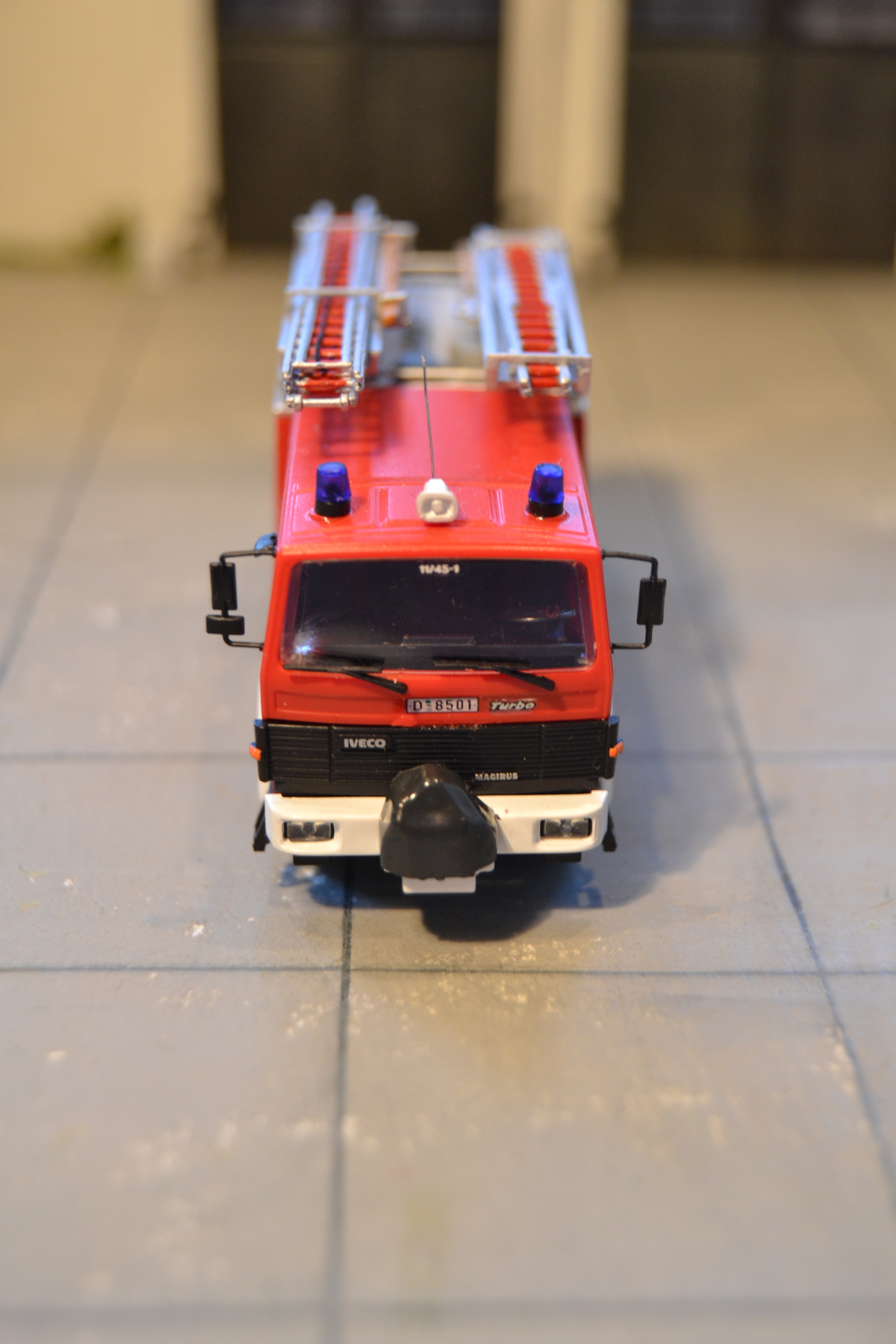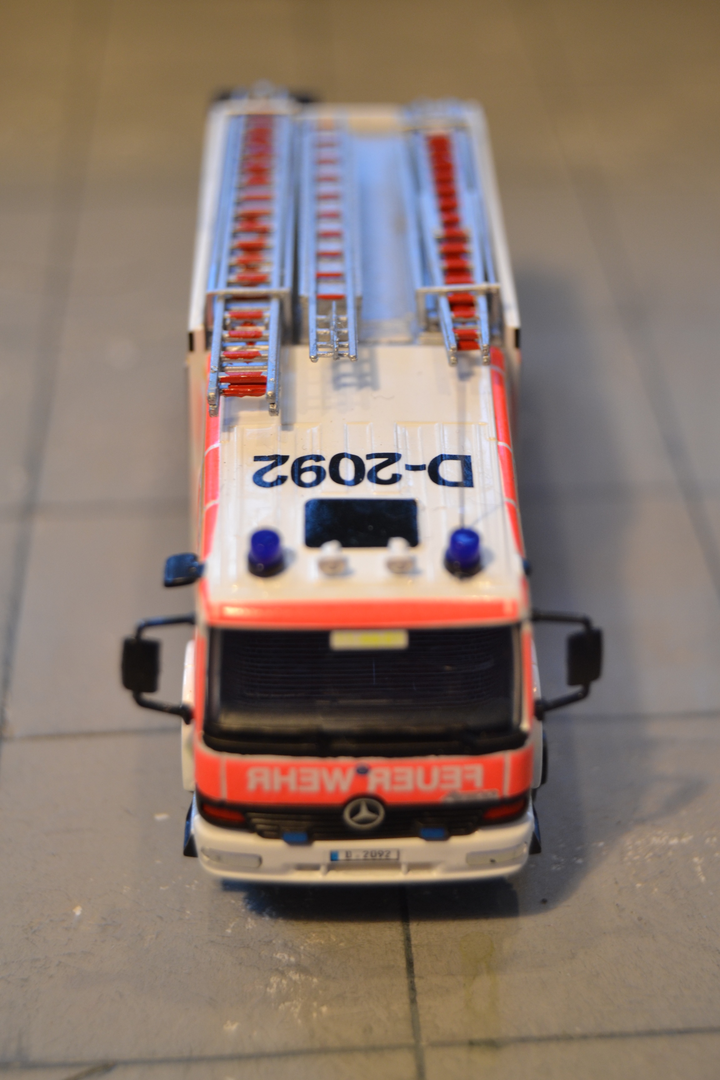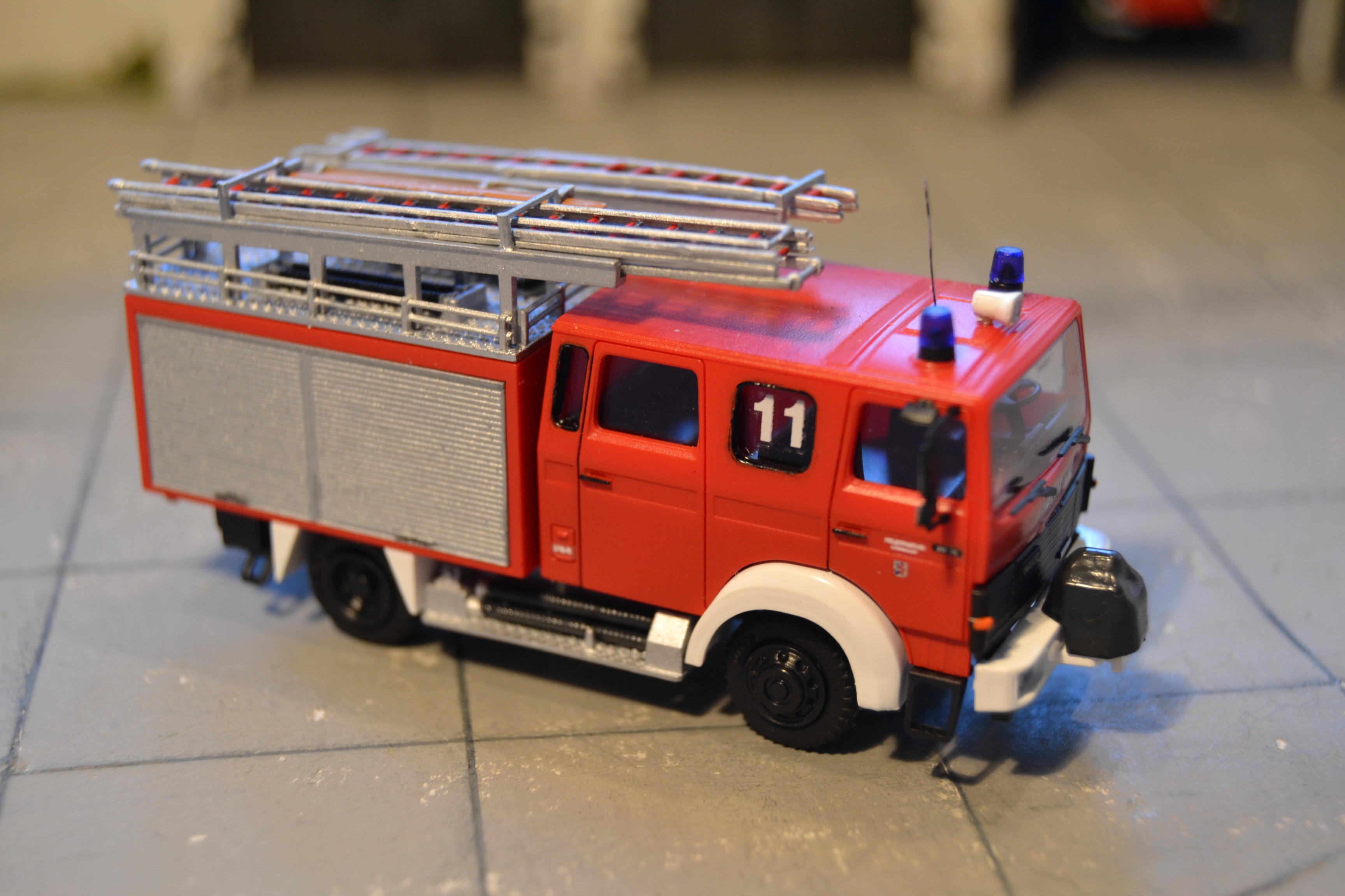 Der Nachbau erfolgte auf der hervoragenden Basis von Rietze...neben einer Neulackierung mit Elita RAL 3000 per Airbrush wurde vor allem das Dach neu bzw. umgestaltet: neue Schlauchbrücken von Roco in entsprechender Halterung, eingepacktes Reserverad, Einreißhaken und Feuerpatschen (alle mit entsprechenden Halterungen) und neue Leitern!