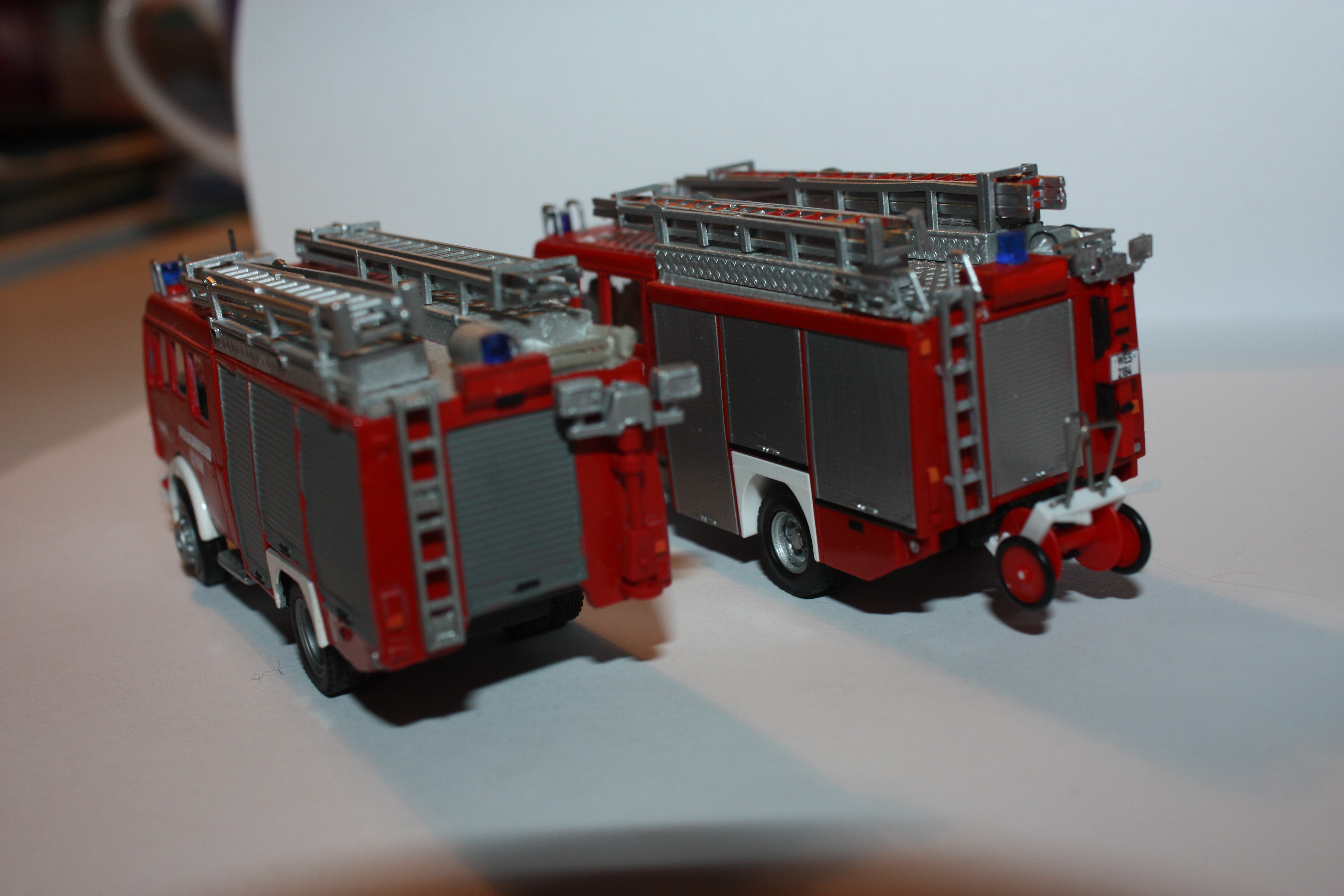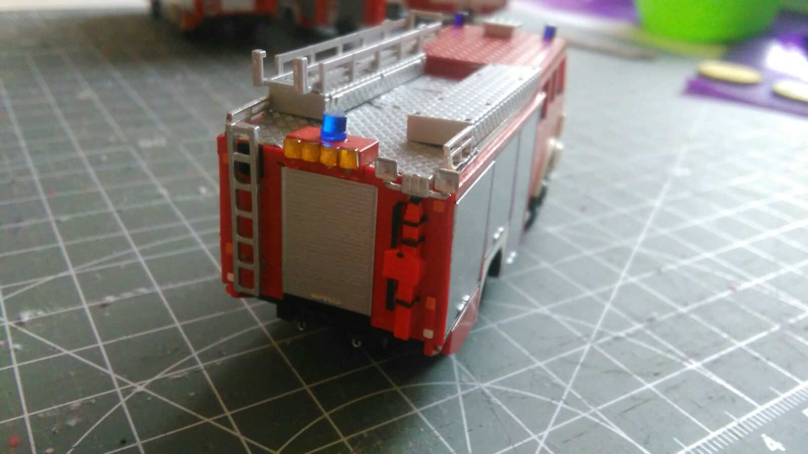 Beim HLF 3/1 könntest du noch Schläuche auf die Haspel packen, die Radkästen schwärzen und die Scheibenwischer bzw. den Bereich darunter auch ein bisschen mit schwarzer Farbe behandeln (ggf. auch die Fenstergummis).