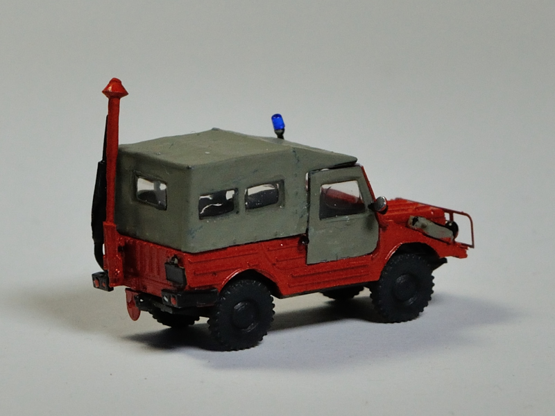 Der hochgelegte Auspuff fehlte bei meinem Modell (vermutlich ein Gießfehler, am Spritzling vorgesehen ist er), ich habe dann aus einer Herpa-Achse und etwas Alufolie einen gebastelt.
