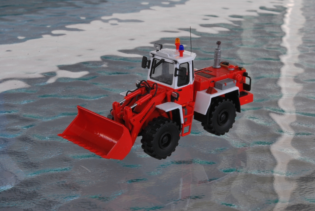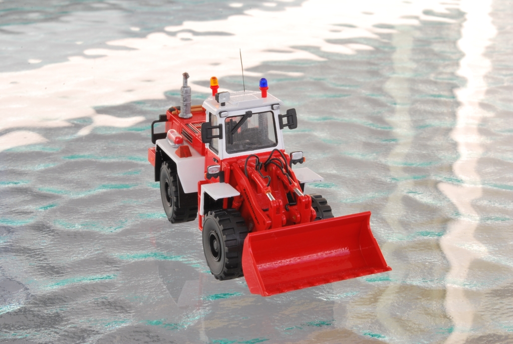 Ich habe dem Radlader ein neues Farbkleid in feuerrot und reinweiß spendiert. Neben einigen Kleinteilen aus der Bastelkiste, wie Feuerlöscher und Gerätekasten, erhielt das Modell nachgebildete Hydraulikleitungen aus dünner Elektroniklitze von Brawa.