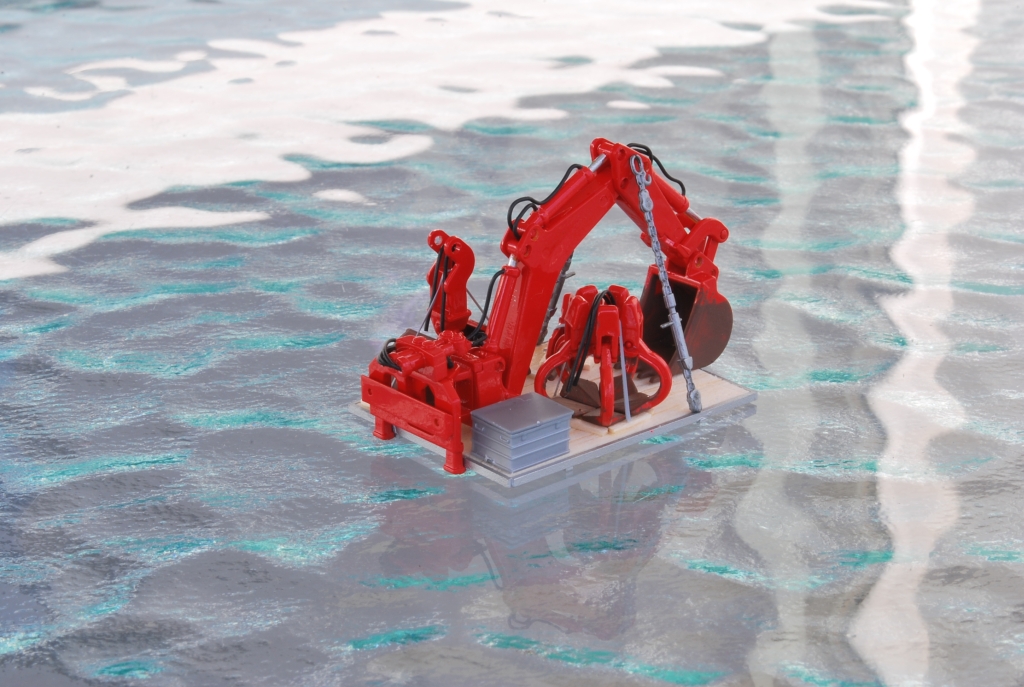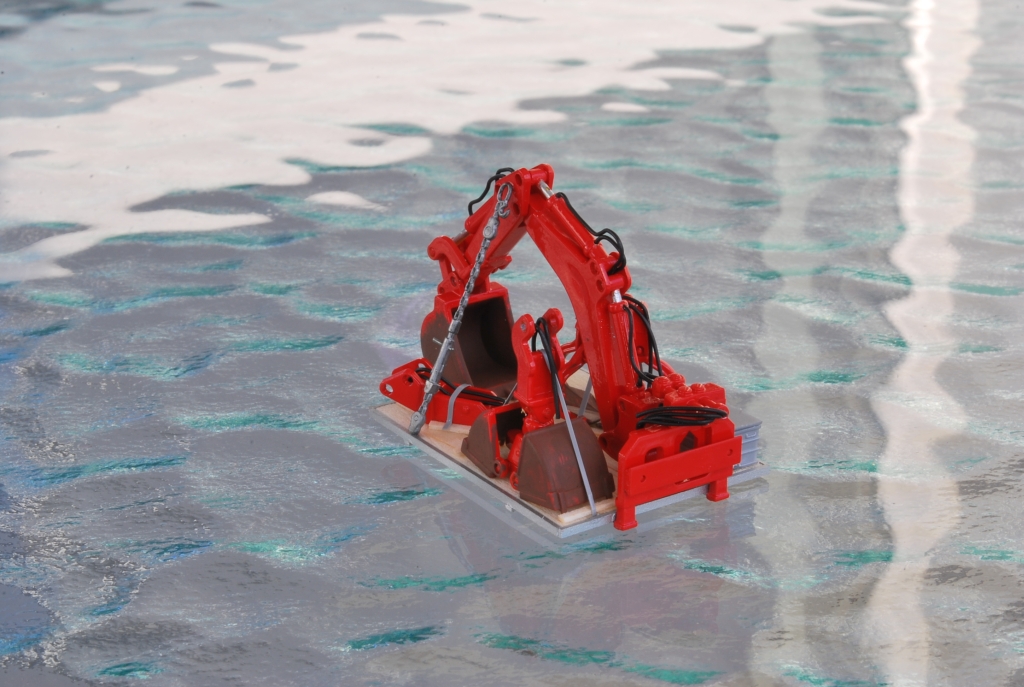 Die Anbaugeräte des "BRmG" habe ich ebenfalls in feuerrot lackiert und auf einer selbstgebauten Geräteplatte für den Transport zur Einsatzstelle platziert. Die Geräteplatte besteht aus Evergreen-Profilen und feinem Balsaholz.