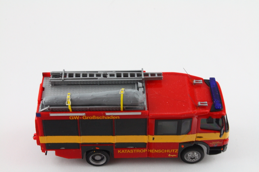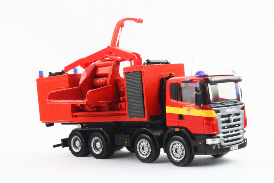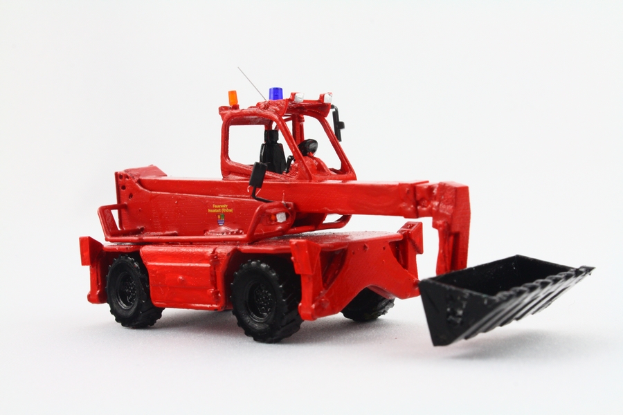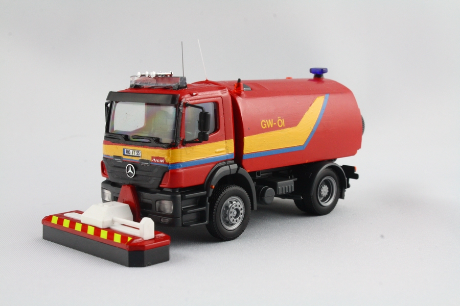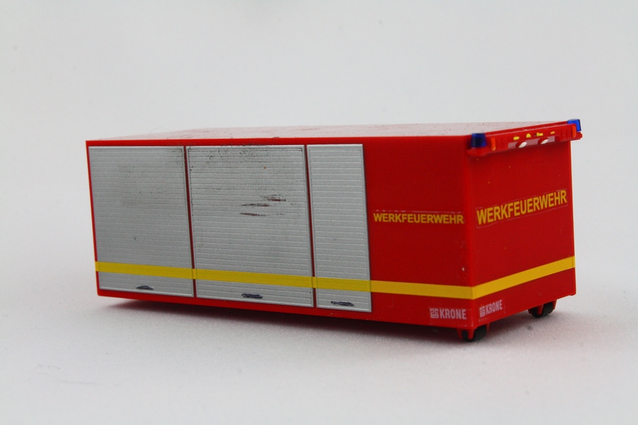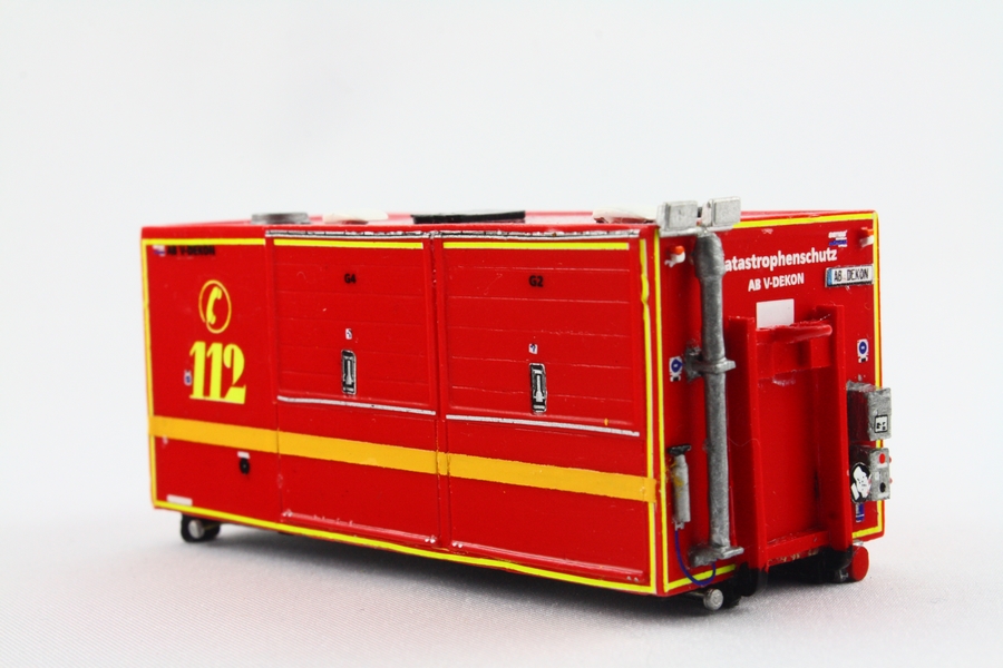 Ich nenne das jetzt mal so. An sich ist das ein Bereich zwischen Berufsfeuerwehr, Freiwilliger Feuerwehr und Leitung der Feuerwehr. hier sind alle Fahrzeuge untergebracht, die ich nicht fest einer Einheit zuordnen wollte. Hier fallen z.B. der KdoW des Leiters der Feuerwehr, der ELW 1, ein kleiner MTW, ein Gabelstapler, ein Teleskoplader (noch im Bau), die drei WLF's und die ganzen ABs rein. KdoW, ELW 1 und MTW sind Serienmodelle, bei denen nur Feinheiten verändert wurden (z.B. beim MTW die Wappen und Funkkenner entfernt). Die WLF wurden farblich angepasst. Beim Scania war es "nur" die gelbe Bauchbinde, andere SoSi, Presslufthorn, Decals und Kennzeichen. Die beiden MA waren da schon aufwendiger. Das 02-er WLF (mit dem durchsichtigen Balken) war ein Messemodell der Feuerwehr Aachen zur Interschutz 2015. Die Lackierung wurde hier grundlegend angepasst, auch hier neue SoSi und Decals.